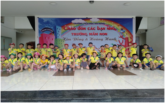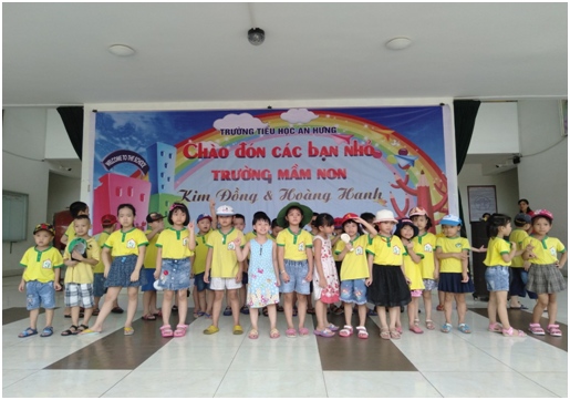Sáng ngày 3 tháng 7 năm 2020 trường mầm non Kim Đồng tổ chức cho các bé khối Mẫu giáo 5 tuổi tham quan trường Tiểu học An Hưng, với mục đích là giúp trẻ được biết về trường tiểu học, địa chỉ của trường, tên trường, một số phòng, nhóm lớp, một số hoạt động của học sinh trường tiểu học. Qua đó giáo dục trẻ yêu trường, yêu lớp, giúp cho trẻ tự tin hơn và sẵn sàng chuẩn bị lên lớp1 học tại trường tiểu học. Việc chuẩn bị tâm thế cho trẻ vào tiểu học là việc làm cần thiết và quan trọng đối với trẻ mẫu giáo 5 – 6 tuổi giúp trẻ hào hứng, khơi gợi ở trẻ lòng mong muốn được lên lớp một trường tiểu học.