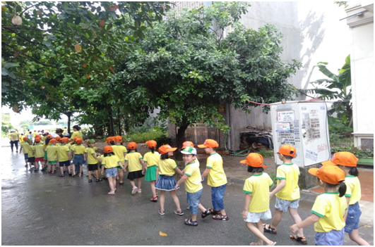 Các bé rất vui vẻ, hào hứng đi ngay ngắn theo hàng để sang thăm trường tiểu học