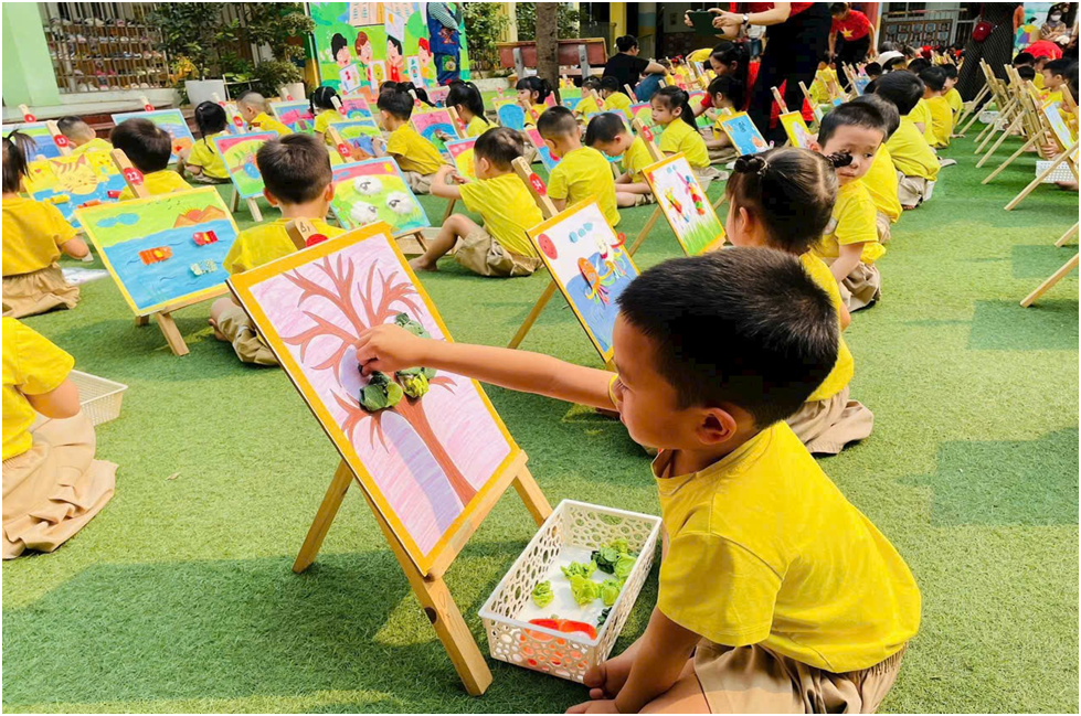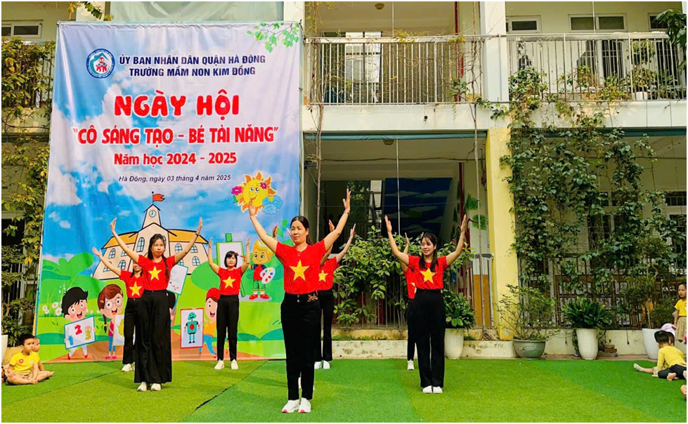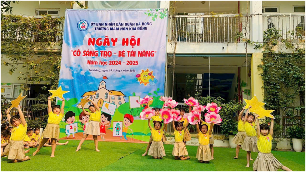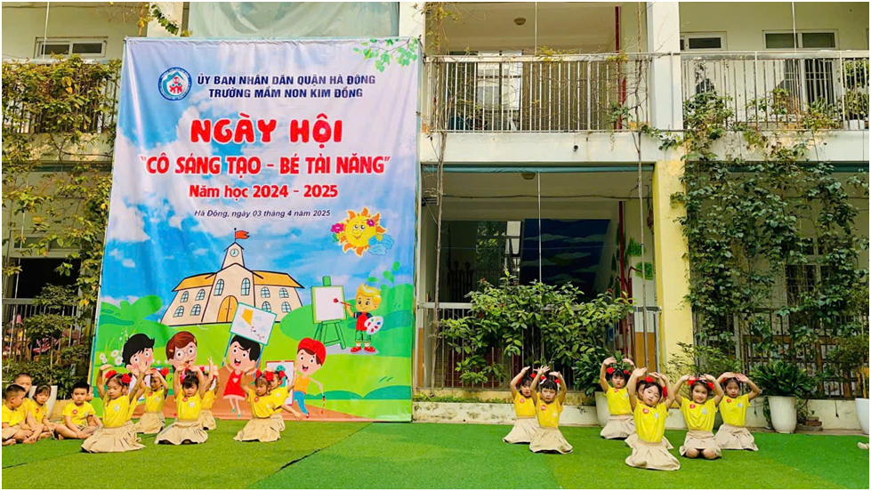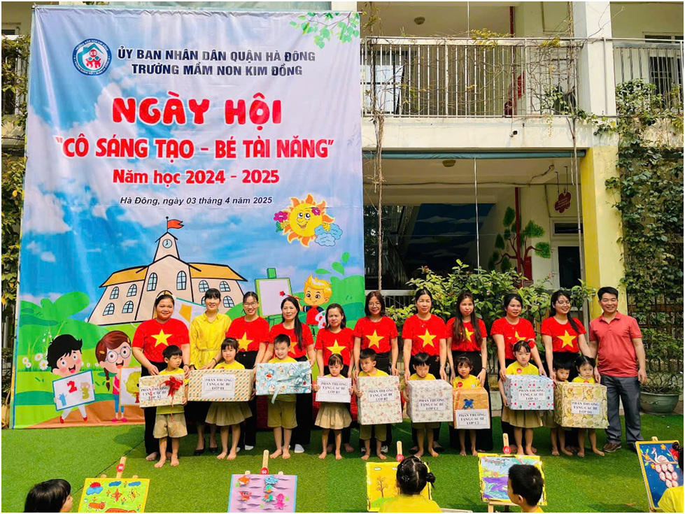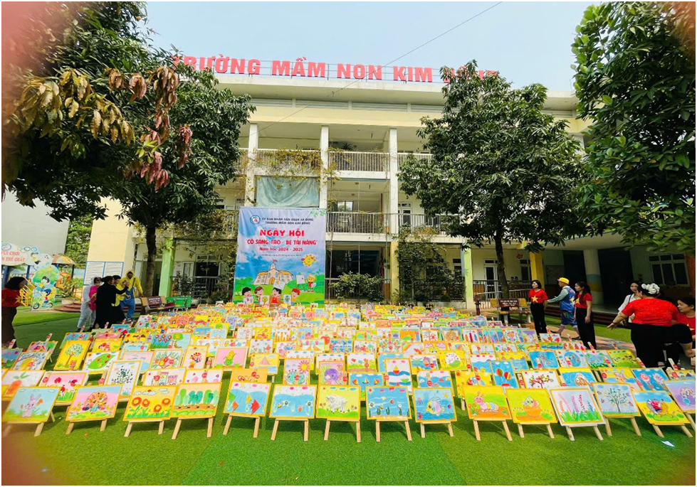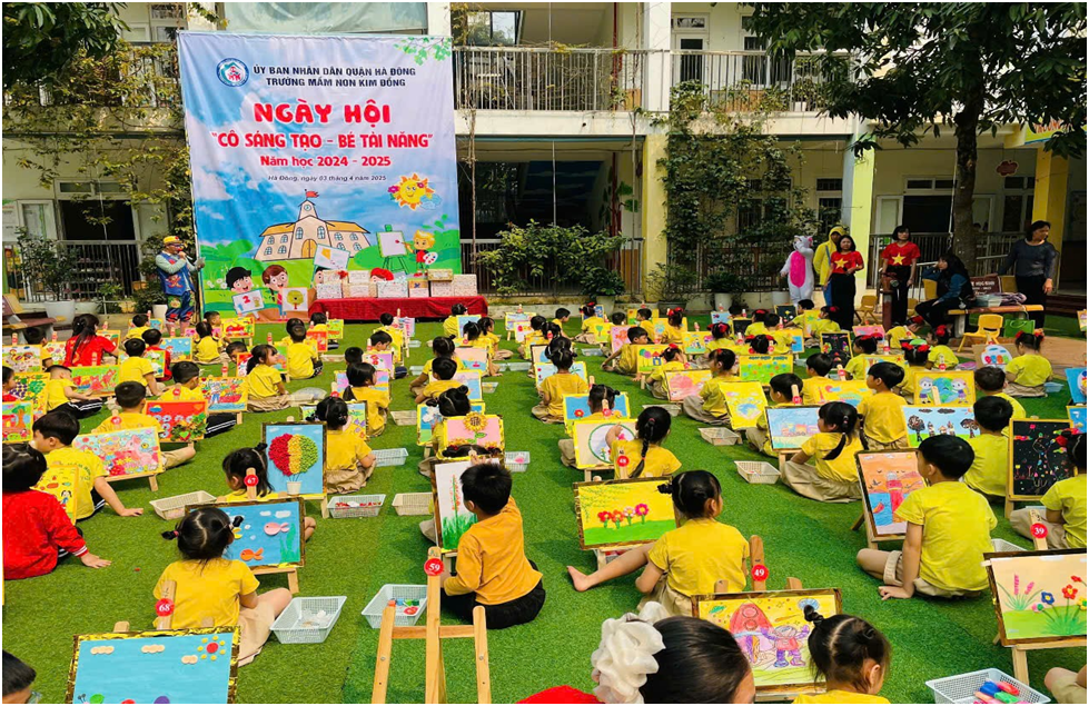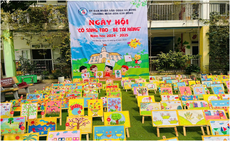 Căn cứ vào kế hoạch thực hiện nhiệm vụ năm học 2024-2025. Sáng ngày 03/04/2025 Trường MN Kim Đồng kết hợp với Hội cha mẹ học sinh và trung tâm bồi dưỡng kỹ năng Sunkids Việt Nam tổ chức Ngày hội “Cô sáng tạo, Bé tài năng” năm học 2024 - 2025. Đến với ngày hội rất vinh dự có sự góp mặt của Ban đại diện CMHS và các quý phụ huynh, đặc biệt là sự tham gia của 100% trẻ của 9 nhóm, lớp. Ngày hội là một hoạt động bổ ích, giúp trẻ được giao lưu học hỏi với các bạn, đồng thời là động lực để thúc đẩy hoạt động giáo dục thẩm mỹ cho trẻ. Trẻ tích cực tham gia các hoạt động tạo hình sẽ giúp trẻ tăng khả năng tư duy sáng tạo, óc quan sát tinh tế, nâng cao trí tưởng tượng, rèn luyện tính kiên nhẫn, tỉ mỉ, bồi dưỡng tâm hồn và cảm xúc cho trẻ. Qua đó, các con mạnh dạn tự tin, tích cực tham gia vào các hoạt động khác; là cơ hội để các con được giao lưu, học hỏi giữa các lớp trong trường. Sau đây là một số hình ảnh trong ngày hội: