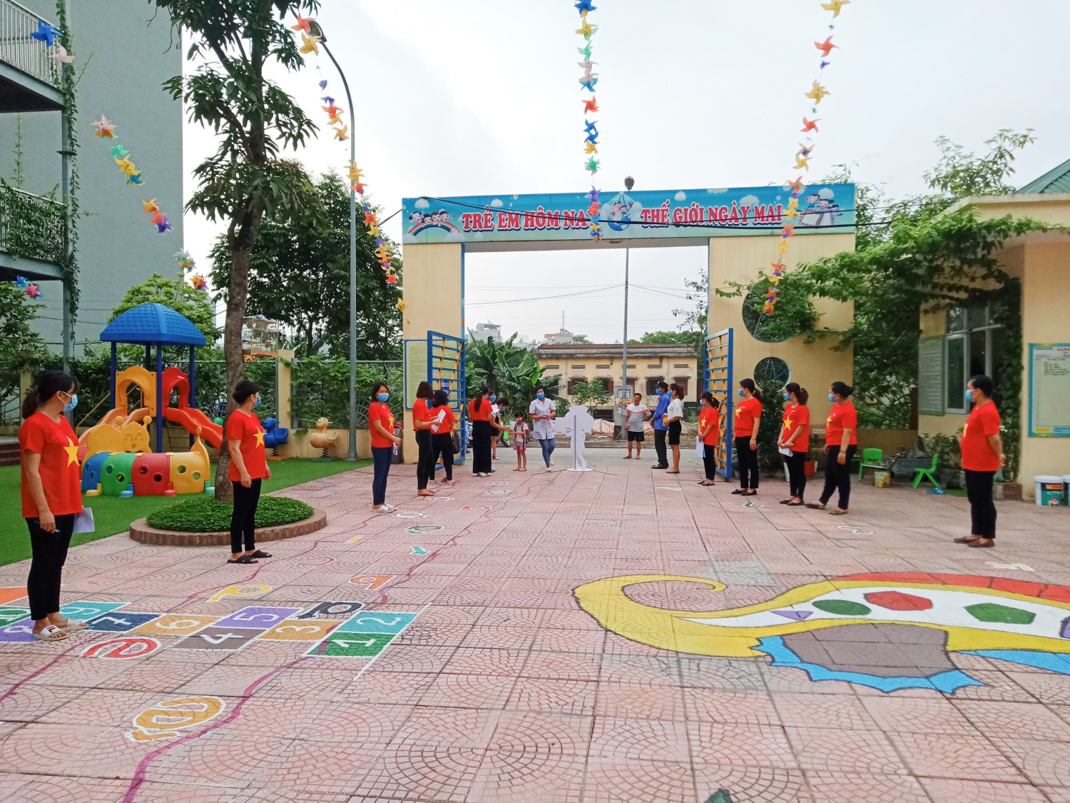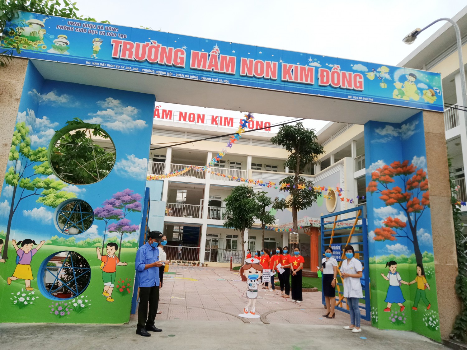 Công tác đón trẻ được nhà trường chuẩn bị rất kỹ lưỡng từng khâu. Từ trang trí làm mới môi trường, sân chơi, lớp học…để hấp dẫn các bé yêu thích đi học hơn. Những hình ảnh bắt mắt được dựng lên ở sân trường chào đón các bé khiến các bé vô cùng thích thú.