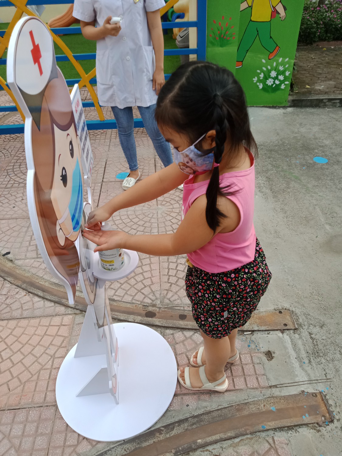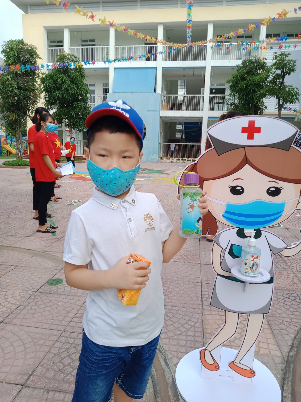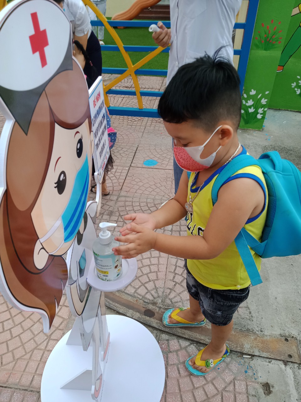 Một số hình ảnh các bé được kiểm tra thân nhiệt và rửa tay sát khuẩn ngay tại cổng trường: