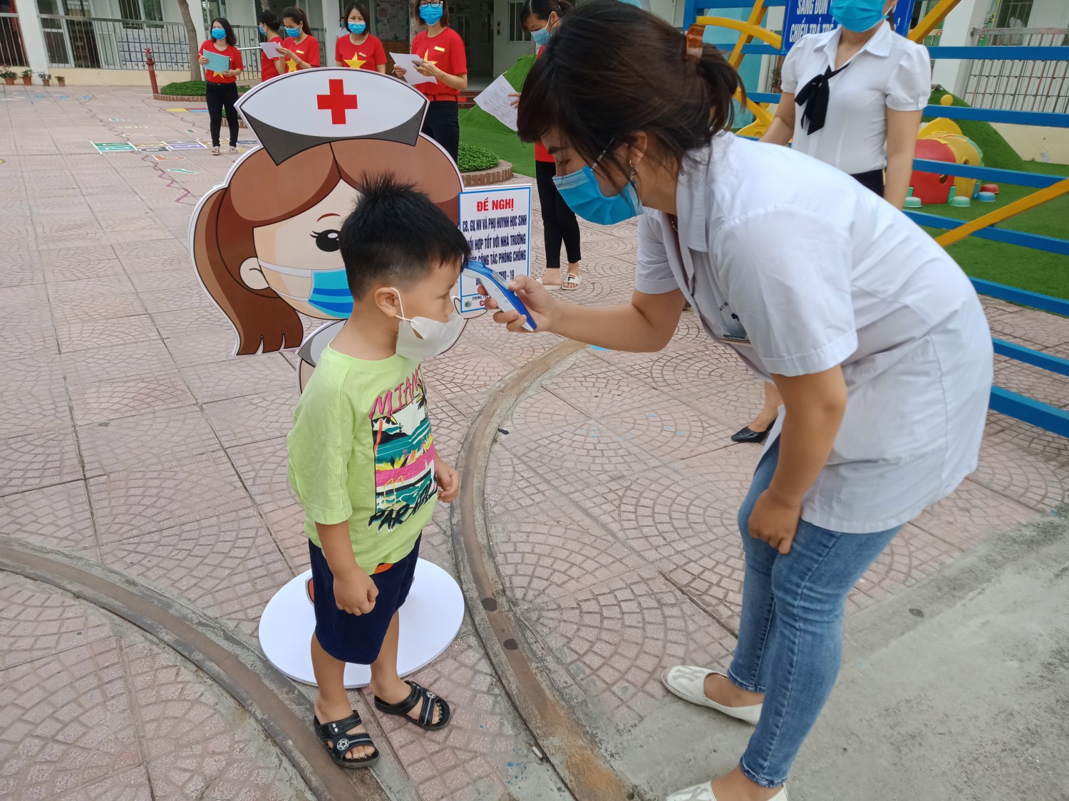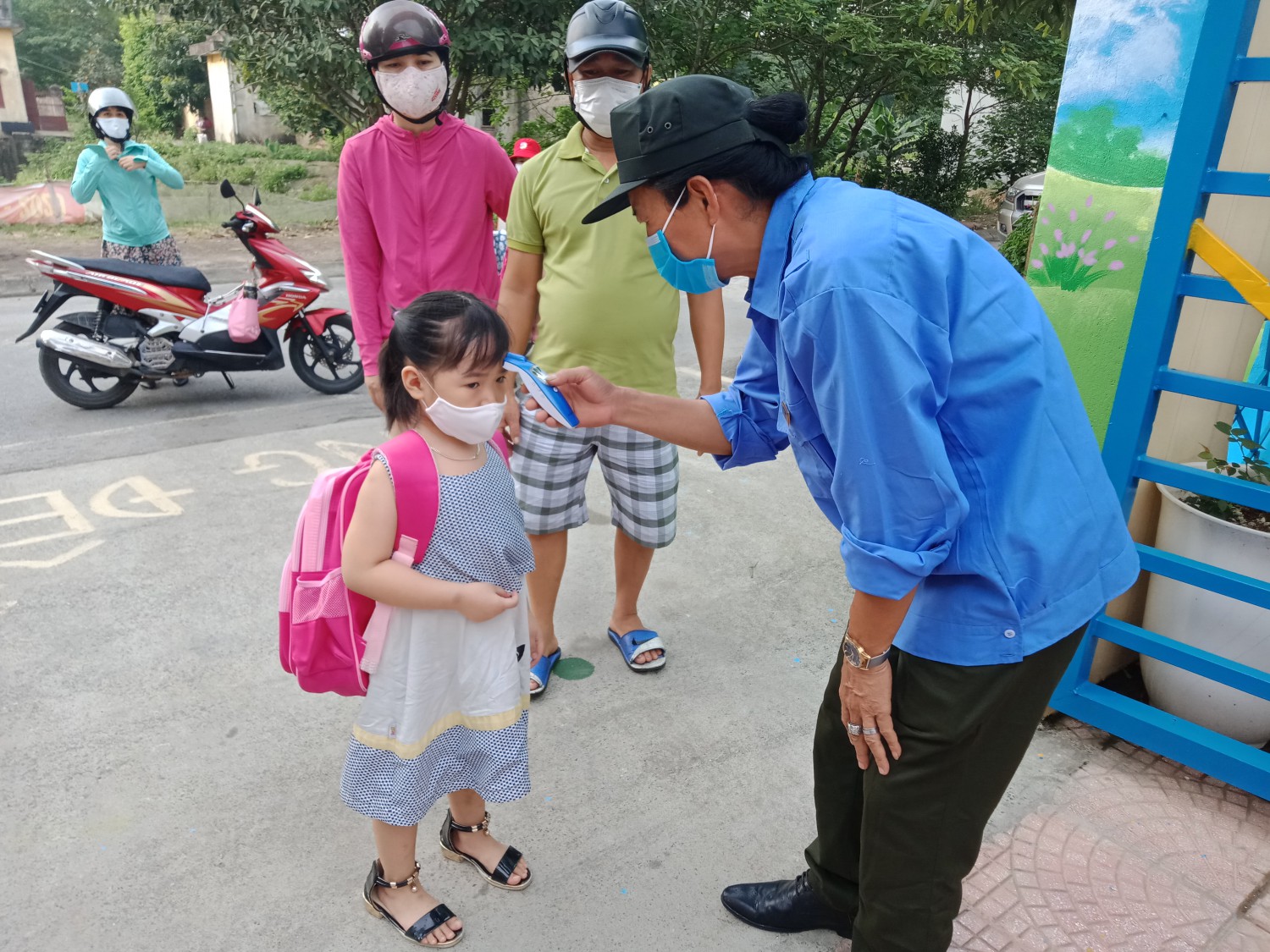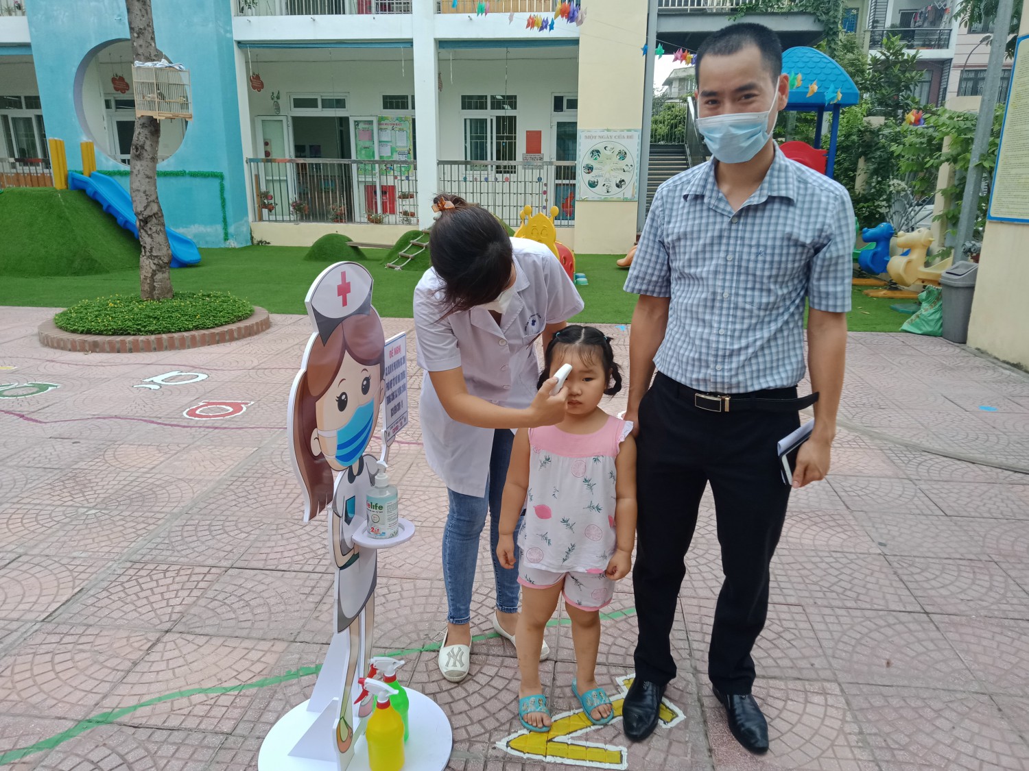 Trước khi vào trường các bé được đo thân nhiệt và xịt rửa tay khô sát khuẩn, kết quả kiểm tra được các cô giáo ghi chép vào sổ rất cẩn thẩn, sau đó cô giáo đón học sinh lớp mình và dẫn bé về lớp.
