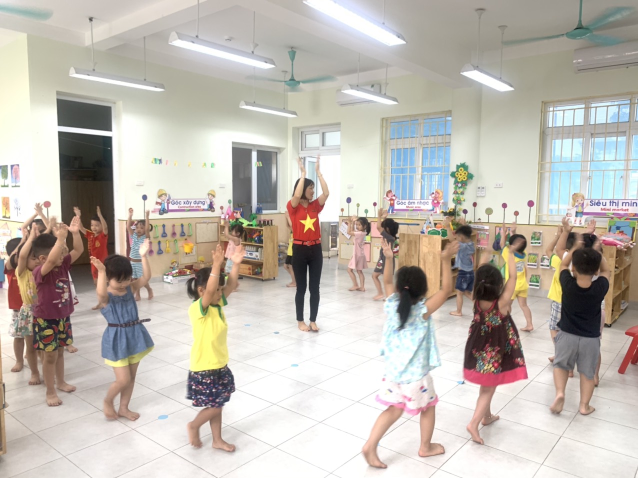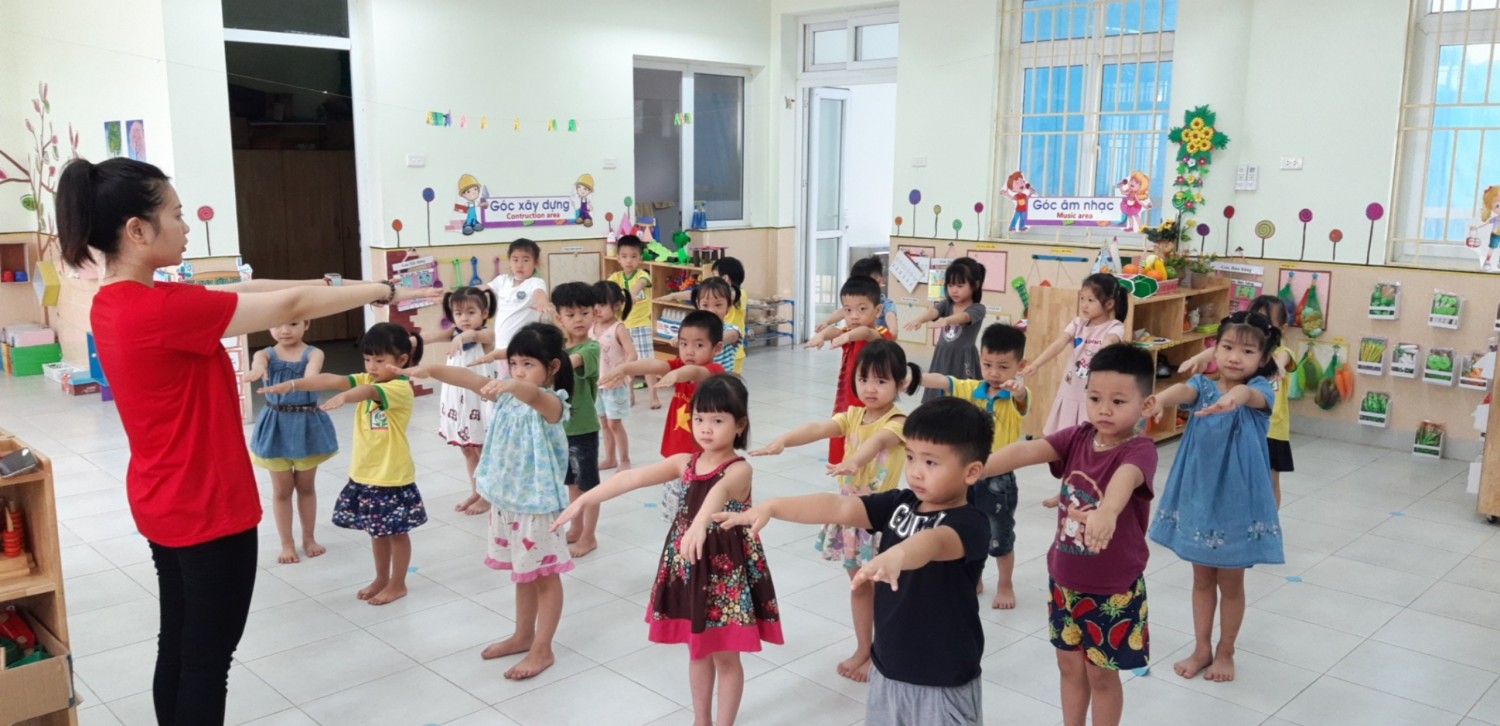Cô Duyên và các bé lớp B1 tập thể dục sáng