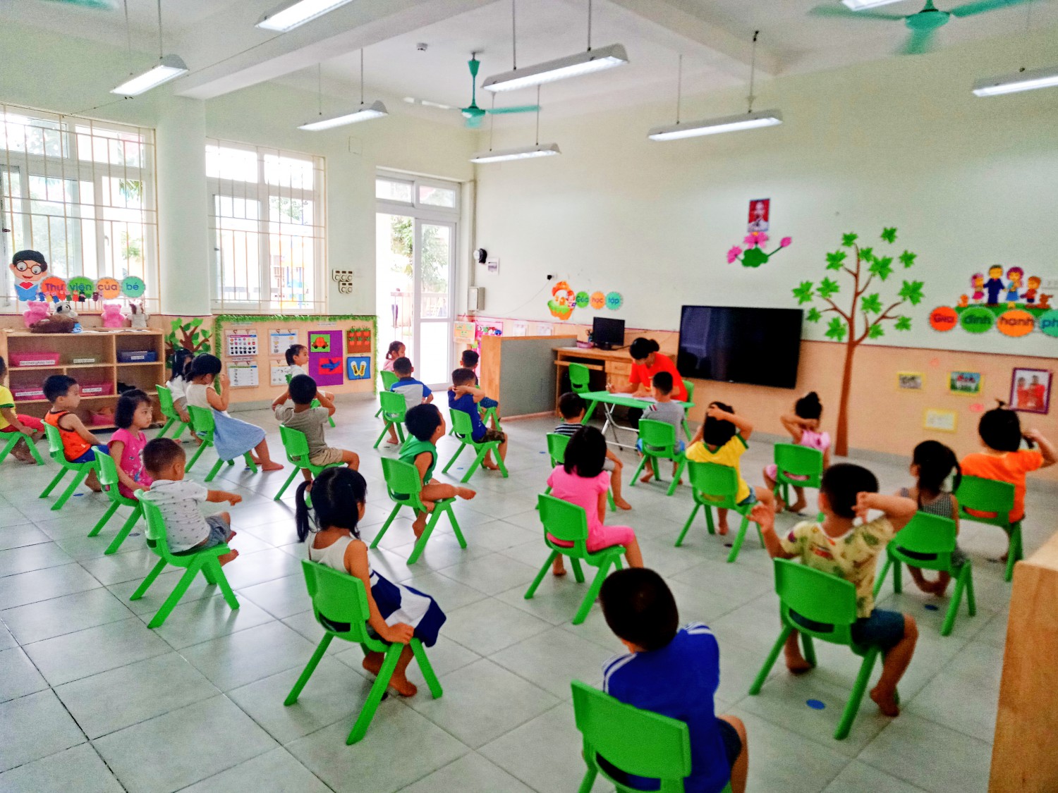 Trong buổi sáng nay, 100% các bé đều đảm bảo sức khỏe để vào lớp, không có trường hợp nào phải nghỉ học. Tổng số trẻ đến trường là 245/350 trẻ đạt 70%, một số cháu xin nghỉ thêm vì vẫn đang ở quê xa với ông bà.