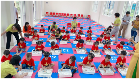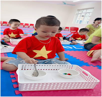 Sáng ngày 27/4/2021, nhà trường tổ chức “Sân chơi hạnh phúc” cho các bé khối 3 tuổi và nhà trẻ với các kỹ năng cài khuy, bấm cúc, xúc hạt.