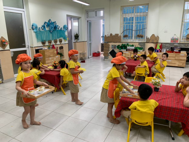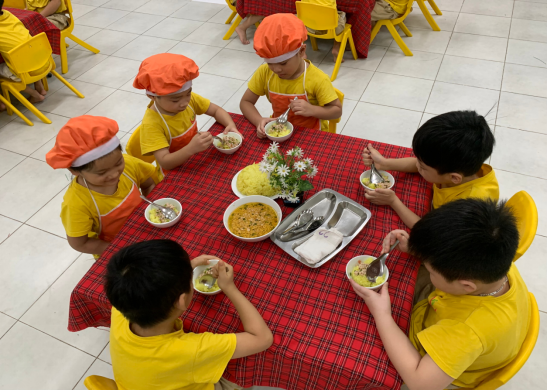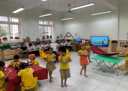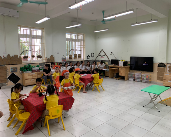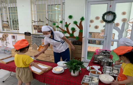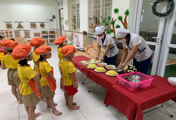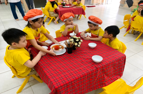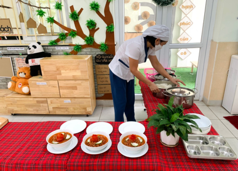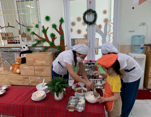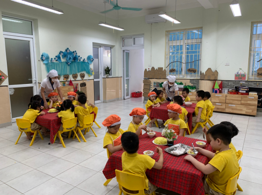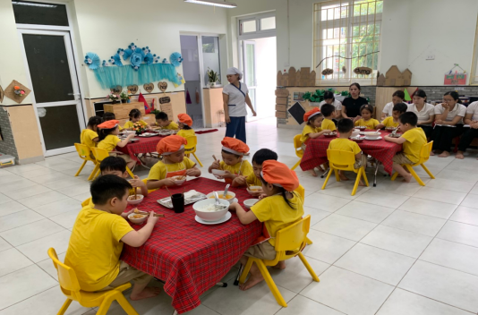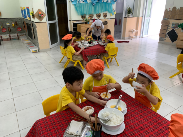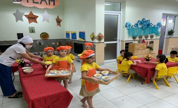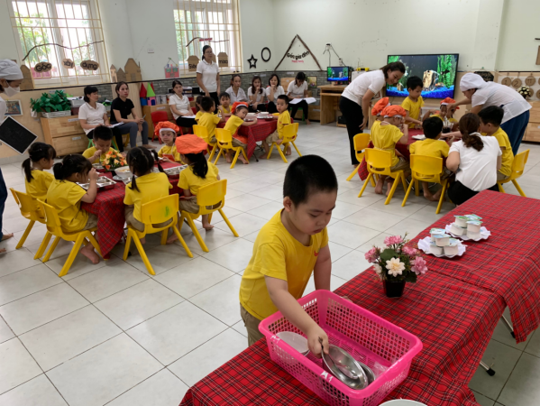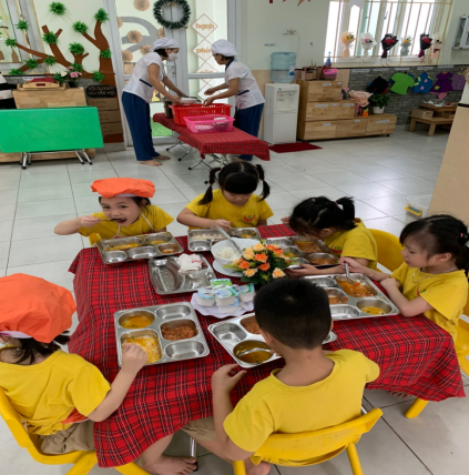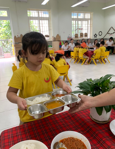 Thực hiện kế hoạch nhiệm vụ năm học 2022-2023; kế hoạch trọng tâm trong tháng 11/2022. Ngày 30/11/2022 trường MN Kim Đồng tổ chức chuyên đề “ Giờ ăn hạnh phúc” qua bữa ăn chính và bữa ăn phụ tại lớp mẫu giáo lớn –A1. Tham dự buổi chuyên đề “Giờ ăn hạnh phúc” có BGH nhà trường và giáo viên các nhóm lớp trong trường. Buổi chuyên đề nhằm chia sẻ cách tổ chức giờ ăn với các hình thức tổ chức đa dạng, phong phú; tạo tâm thế sẵn sàng cho trẻ vào bữa ăn,giúp trẻ ăn ngon miêng, hết suất;đảm bảo sự phát triển toàn diện, tăng cường sức khỏe, sức đề kháng cho trẻ; tạo không khí vui tươi để trẻ ăn ngon miệng, góp phần nâng cao chất lượng chăm sóc. Để đảm bảo đem đến bữa ăn chất lượng, thực đơn cho bé hằng ngày được nhà trường xây dựng đảm bảo chế độ dinh dưỡng đầy đủ năng lượng và vi chất cho trẻ theo từng độ tuổi. Thực đơn của nhà trường cũng thường xuyên được thay đổi theo tuần, theo mùa để đảm bảo sự phong phú cho mọi trẻ. Nguồn thực phẩm chế biến đảm bảo an toàn vệ sinh thực phẩm và được cung cấp bởi những công ty cung ứng thực phẩm có đầy đủ hồ sơ năng lực tư cách pháp nhân, được các cấp phê duyệt. Trường mầm non Kim Đồng cam kết tuân thủ chặt chẽ các bước quy trình Vệ sinh an toàn thực phẩm theo quy định của Bộ Y tế: Từ khâu lựa chọn nhà cung cấp, giao nhận thực phẩm về số lượng và chất lượng; sơ chế, chế biến; kiểm sát giám sát, lưu mẫu, chia đồ ăn chín theo khẩu phần và các bước sau khi trẻ ăn xong… Bữa ăn của trẻ không chỉ đảm bảo đủ lượng và chất dinh dưỡng mà việc thay đổi hình thức các bữa ăn cho trẻ cũng vô cùng cần thiết và quan trọng. Những bữa ăn đa dang, phong phú về hình thức, cách thức tổ chức giúp trẻ có thêm những kiến thức về văn hóa ăn uống trong cuộc sống hằng ngày, đồng thời kích thích trẻ vui vẻ, hứng thú, tự giác với giờ ăn hơn. Chuyên đề "Giờ ăn hạnh phúc" tại trường Mầm non Kim Đồng thật vui vẻ và hạnh phúc với trẻ. Qua giờ ăn trẻ được rèn luyện thói quen dùng đũa, dùng thìa đúng cách, kỹ năng tự phục vụ cho bản thân, chia sẻ, giúp đỡ bạn bè, tạo tâm lý thoải mái, kích thích cảm giác ăn ngon miệng cho trẻ và cùng bạn thưởng thức bữa ăn vui vẻ, hạnh phúc nhất. Chuyên đề tổ chức cho trẻ ăn với nhiều loại đồ dùng: Với trẻ ăn bằng bát, đũa: Trẻ cùng nhau chuẩn bị bát, đũa, thức ăn, đồ ăn tráng miệng cho cả bàn. Trẻ tự lấy cơm và xúc thức ăn theo nhu cầu,sau khi ăn xong bát thứ nhất, bát thứ hai trẻ tự xúc cơm và thức ăn tại bàn. Với trẻ ăn khay từng trẻ tự lấy khay, thìa, đồ ăn tráng miệng, thức ăn vào khay của mình về bàn ăn. Với những trẻ chưa thuần thục cách ăn bằng bát, đũa và ăn bằng khay thì giáo viên vẫn tổ chức cho trẻ ăn sau khi cô lấy cơm và thức ăn vào bát 1; bát 2 trẻ tự lấy đồ ăn tại bàn. Việc cho trẻ tự chọn thức ăn, lấy lượng thức ăn theo nhu cầu giúp trẻ, ăn thoải mái, ngon miệng, ăn theo nhu cầu. Giúp giáo viên đỡ vất vả trong giờ ăn vì không còn phải ép trẻ ăn và có nhiều thời gian quan sát, theo dõi, uốn nắn kỹ năng cho trẻ. Quá trình tổ chức giờ ăn đã giáo dục hành vi văn minh, lịch sự trong ăn,giáo dục cho trẻ kỹ năng tự phục vụ và quan tâm đến người xung quanh: Trước khi ăn trẻ biết phân công nhóm bạn chuẩn bàn ăn, ghế ngồi, đồ dùng phục vụ cho giờ ăn. Trong khi ăn trẻ biết tự lấy cơm, tự chọn thức ăn, lấy lượng thức ăn theo nhu cầu giúp trẻ, ăn thoải mái, ngon miệng, ăn theo nhu cầu . Sau khi ăn xong trẻ biết xúc miệng nước muối, thu dọn bàn ăn, cất bàn, ghế; đi vệ sinh, uống nước ngồi chơi nhẹ nhàng. Bữa ăn của bé tại Trường mầm non Kim Đồng không chỉ đủ dinh dưỡng, đảm bảo an toàn mà còn cả tình yêu thương mong muốn gửi đến trẻ được mang vào từng món ăn. Một số hình ảnh trong buổi tổ chức chuyên đề “Giờ ăn hạnh phúc” bữa ăn chính: “Cơm tám thơm; Thịt bò sốt vang; Canh bí đỏ nấu thịt lơn; tráng miệng sữa chua” tại lớp mẫu giáo lớn A1- Trường MN Kim Đồng:
