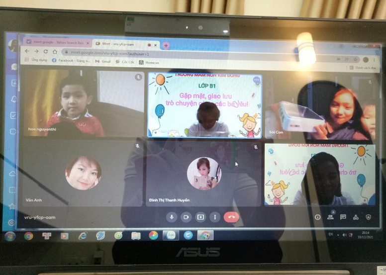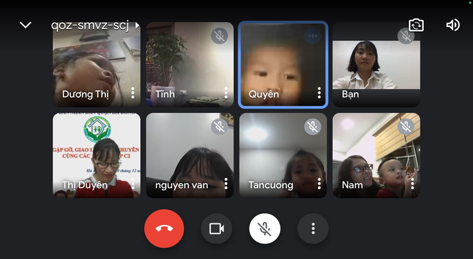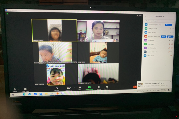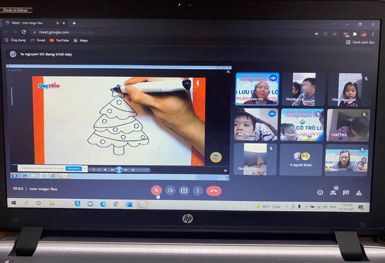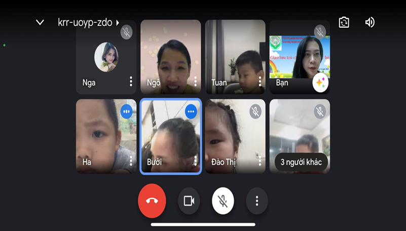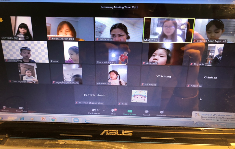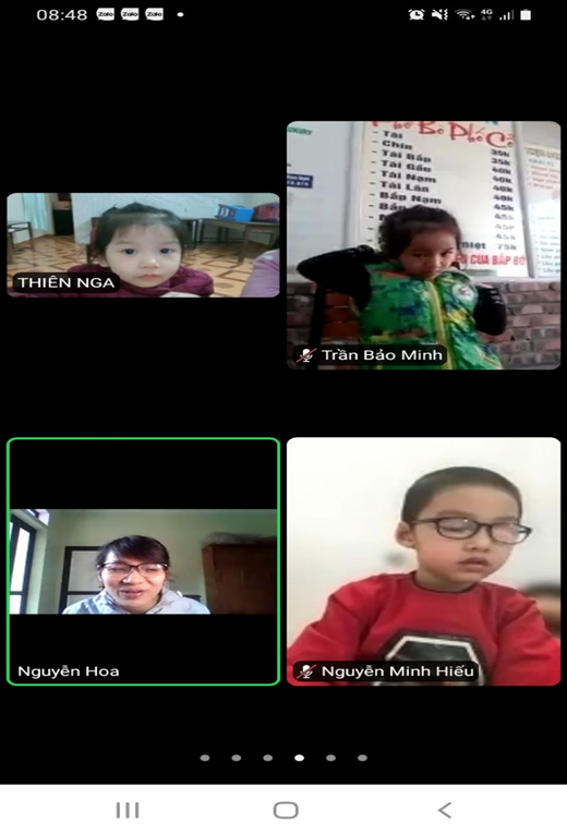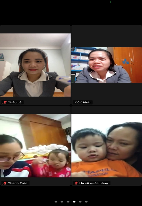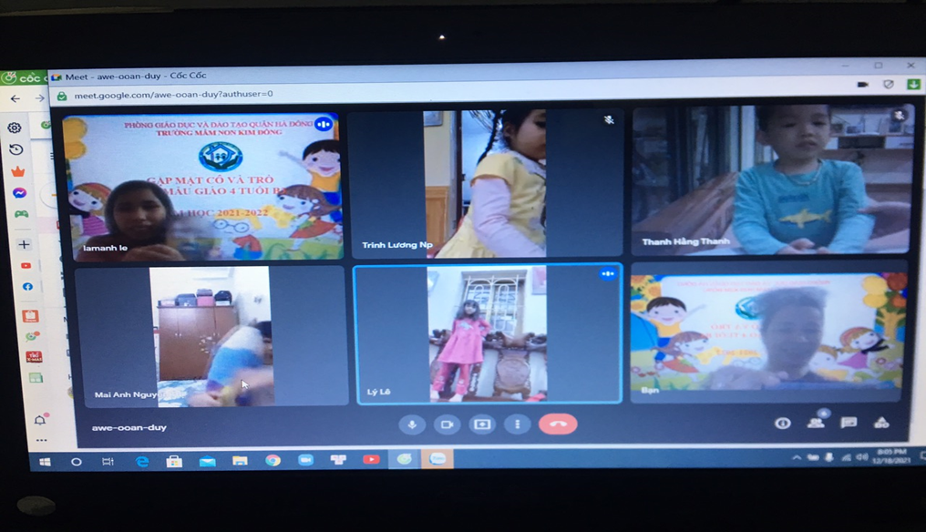 Do dịch bệnh COVID-19 diễn biến phức tạp nên từ đầu năm học 2021-2022 các cô giáo và các bé vẫn chưa được đến trường, chưa được gặp nhau dưới mái trường MN Kim Đồng. Tuy không thể triển khai các hoạt động giáo dục trực tiếp cho trẻ nhưng thay vào đó, nhà trường đã tận dụng các phương tiện, nền tảng mạng xã hội để truyền tải kiến thức chăm sóc, giáo dục trẻ tại nhà cho phụ huynh. Tăng cường công tác tuyên truyền, liên hệ, hướng dẫn phụ huynh thực hiện chế độ dinh dưỡng khoa học, hợp lý và tổ chức cho trẻ em hoạt động vui chơi tại nhà. Giáo viên và các phụ huynh đã thành lập nhóm lớp qua zalo để chia sẻ, tư vấn việc nuôi dưỡng, chăm sóc, giáo dục trẻ em ở nhà; phân công giáo viên phụ trách nhóm, lớp nắm bắt cụ thể về tình hình sức khỏe của trẻ em trong thời gian qua. Yêu cầu giáo viên lựa chọn và hướng dẫn phụ huynh tổ chức những hoạt động giáo dục phù hợp với điều kiện chăm sóc, giáo dục trẻ em tại nhà; các nội dung, hình thức hoạt động cho trẻ em luôn đảm bảo an toàn và đáp ứng yêu cầu về giáo dục. Nhà trường đã chỉ đạo các giáo viên xây dựng kế hoạch giáo dục sao cho phù hợp. Trên cơ sở đó, các tổ khối sẽ phân công giáo viên thực hiện tự quay những video về các bài hướng dẫn trẻ tự chăm sóc bản thân, các kỹ năng cần thiết, các hoạt động theo kế hoạch đã xây dựng của tổ khối… Các video này ngoài việc được đăng tải trên website của trường tại địa chỉ http://mnkimdong.pgdhadong.edu.vn thì nhà trường cũng tận dụng các nền tảng mạng xã hội để đăng tải nhằm phổ biến rộng rãi đến tất cả các bậc phụ huynh những kiến thức cần thiết trong chăm sóc, giáo dục trẻ tại nhà. Bên cạnh đó, do đã có danh sách trẻ, số điện thoại của phụ huynh, nên giáo viên đã tạo nhóm/lớp trên Zalo để gửi các video này cho các phụ huynh”. Với hình thức này, trường đã xây dựng và hoàn thành nhiều video hướng dẫn chăm sóc, giáo dục trẻ tại nhà rất hữu ích, được nhiều phụ huynh đánh giá cao. Có thể kể đến như: Kỹ năng chào hỏi đúng cách (giáo viên Lê Thị Liên thực hiện); kỹ năng gấp quần án (giáo viên Ngô Thị Duyên thực hiện); kỹ năng “Không chơi với những đồ vật có thể gây nguy hiểm” (giáo viên Nguyễn Thị Bích Lệ thực hiện); câu chuyện “Quả trứng (giáo viên Lê Thị Thảo thực hiện); làm quen chữ cái a,ă,â (giáo viên Đoàn Thị Anh Đào thực hiện); làm quen với toán “Đếm đến 3, nhận biết nhóm số lượng trong phạm vi 3” (giáo viên Ngô Thị Duyên thực hiện); hoạt động với đồ vật: Gắp, thả đồ vật (giáo viên Lê Thị Thảo thực hiện) … Dù là sản phẩm do giáo viên tự quay nhưng qua theo dõi, các video này có nội dung rất phong phú, dễ hiểu. Không chỉ có giáo viên “xuất hiện” mà song song với lời hướng dẫn của giáo viên còn có những hình ảnh sinh động minh họa cho lời hướng dẫn nên rất dễ làm theo, rất phù hợp với trẻ em. Ngoài việc tự quay các video nói trên, nhà trường, giáo viên còn tích cực sưu tầm, chia sẻ đến các phụ huynh những nội dung bổ ích, phù hợp với lứa tuổi của trẻ. Những cách làm đang góp phần tích cực trong việc giáo dục lối sống lành mạnh, kỹ năng cần thiết cho trẻ tại nhà khi chưa thể đến trường. Đó cũng là minh chứng cho những nỗ lực của nhà trường, của giáo viên trong việc quan tâm, chăm lo đến các bé trong nhà trường. Dù dừng đến trường nhưng không dừng việc học. Bên cạnh việc phối hợp với phụ huynh trong chăm sóc, nuôi dưỡng, giáo dục trẻ qua các hình thức thì nhà trường cũng chỉ đạo các nhóm lớp thường xuyên kết nối, giao lưu, gặp mặt trẻ và phụ huynh trên zoom, google meet….để tăng thêm tình cảm giữa cô giáo và trẻ, phối hợp đồng hành giữa nhà trường, giáo viên và phụ huynh. Qua các buổi gặp mặt, giao lưu đó, cô trò được trò chuyện, vui đùa, hỏi thăm sức khoẻ, được chơi các trò chơi, được hoạt động cùng nhau. Dù chỉ là qua màn hình nhỏ nhưng cũng mang đến cho cô giáo, các bé, phụ huynh nhiều niềm vui, phấn khởi. Sau đây là một số hình ảnh của các buổi giao lưu của các cô giáo, các bé và phụ huynh: