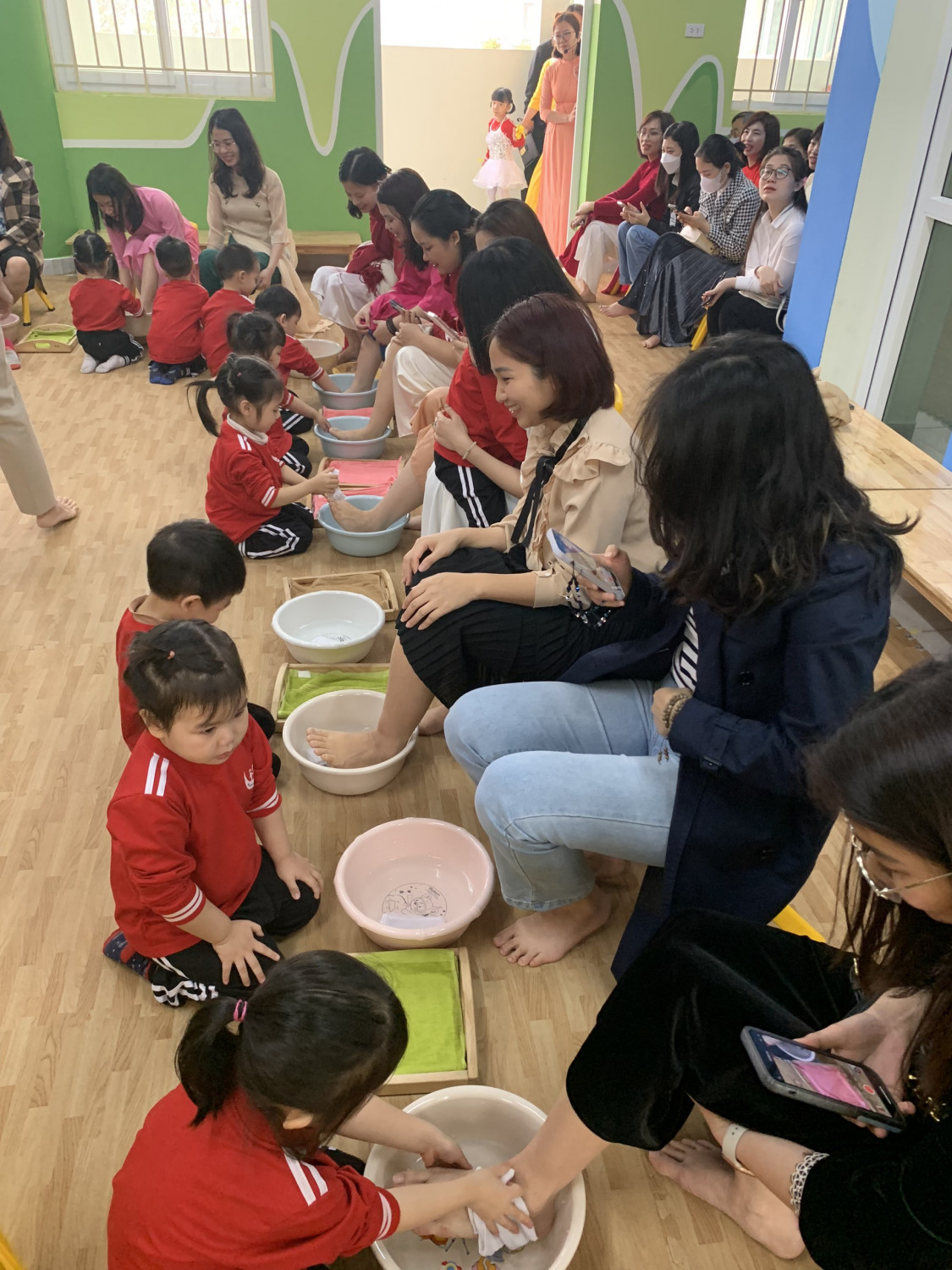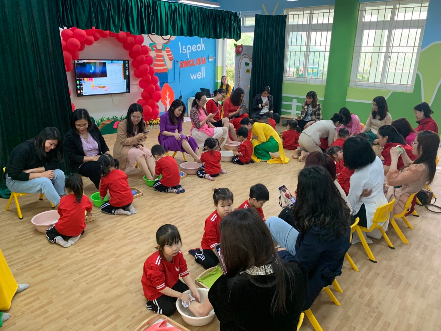 Kết thúc hoạt động bằng trò chơi “ Bàn tay yêu thương” vô cùng thú vị và mang đến nhiều bất ngờ. Chỉ qua đôi bàn tay nhỏ xíu của con, mẹ đoán xem đâu là bàn tay của con mình, và tất cả các cặp đôi mẹ con đã tìm được đến nhau qua sự thấu hiểu và chăm sóc con hàng ngày.