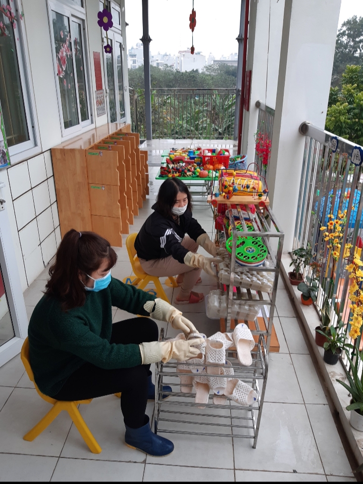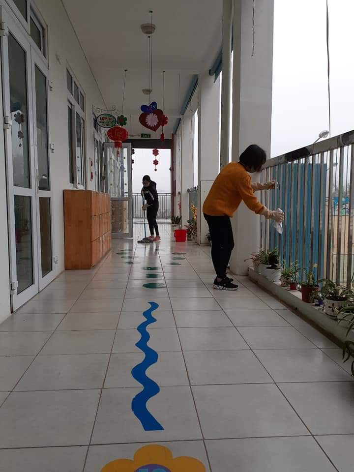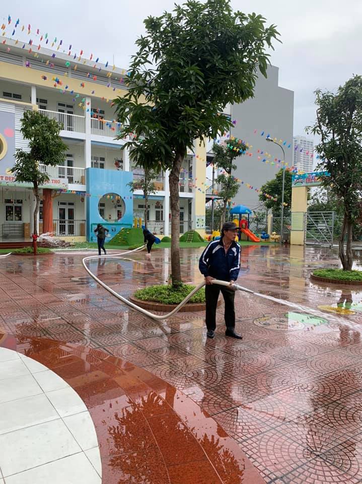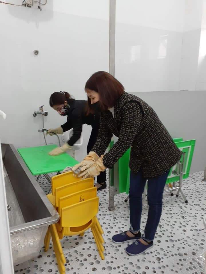 + Nhà trường tăng cường công tác khử khuẩn trường học, tổng vệ sinh trong và ngoài lớp học, đồ dùng đồ chơi hàng ngày, hàng tuần để đảm bảo vệ sinh sạch sẽ. Một số hình ảnh công tác phòng chống dịch bệnh của nhà trường: