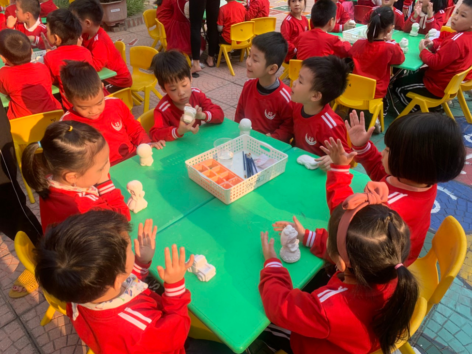 Sau những tiết mục văn nghệ, các bé được tham gia trải nghiệm “Tô tượng” với những sắc màu . Các bé được thoả sức tô màu cho đồ vật của mình thật đẹp và sáng tạo. Các bé thích thú và say sưa hoạt động: