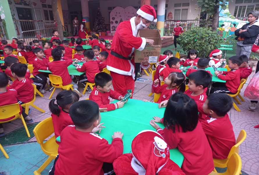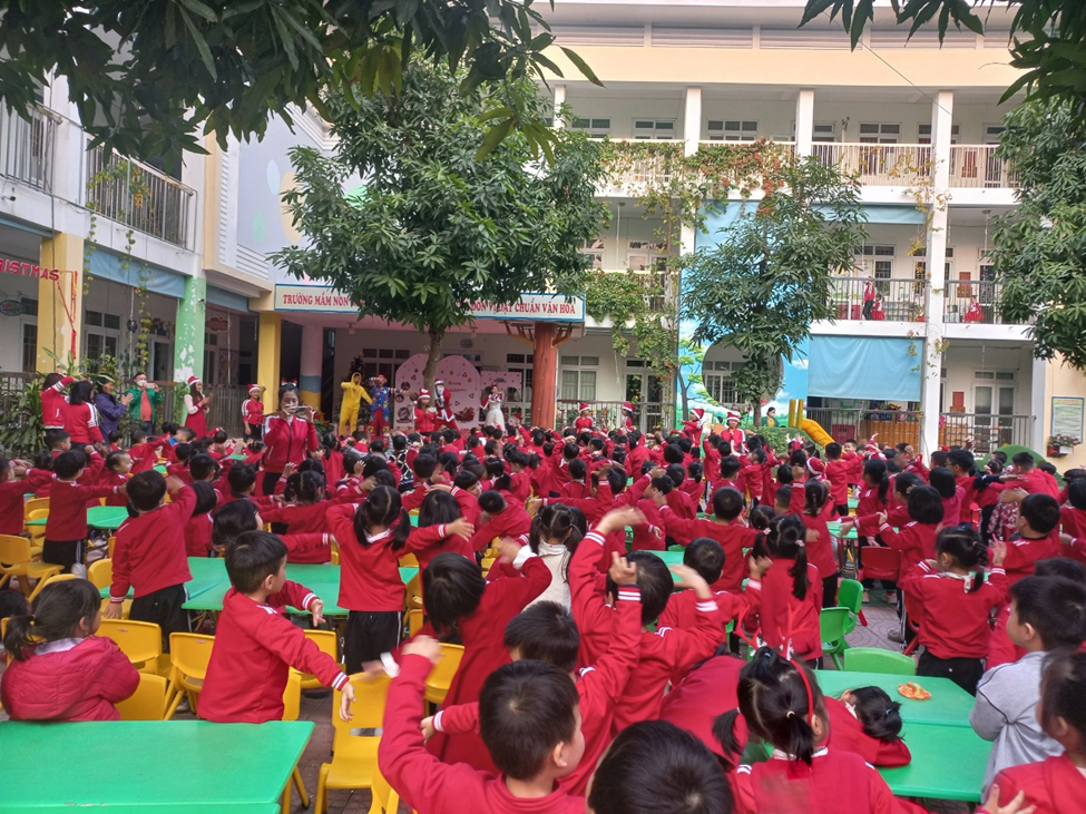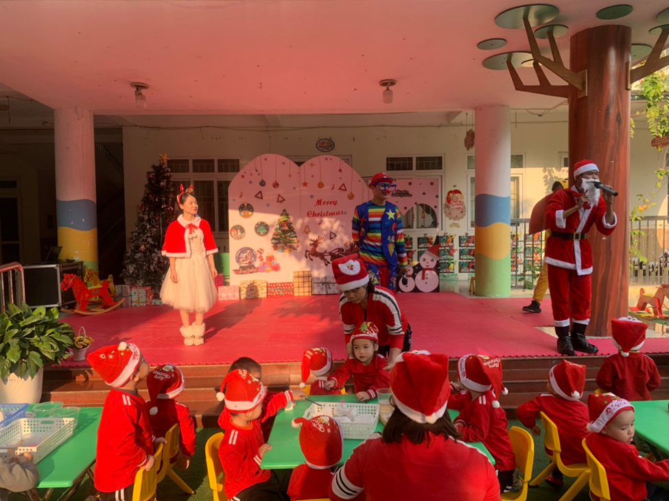 Phần hoạt động trải nghiệm kết thúc, Không khí của buổi liên hoan nóng hẳn lên khi tất cả các bé cùng hướng mắt về sân phía trước sân trường, chào đón sự xuất hiện của ông già Noel và Công chúa Tuyết. Bài hát Jingle Bel ngân vang, các bé đã vui sướng vỗ tay reo mừng và hân hoan đón chào ông. Ông già Nôel, công chúa tuyết trò chuyện, giao lưu và chơi các trò chơi cùng các bé rất vui nhộn. Niềm vui, thích thú hiện rõ trên những khuôn mặt đáng yêu của các bé.