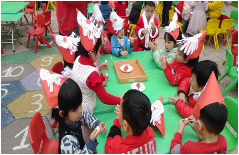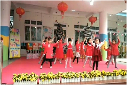 Tiết mục múa “ Vui Noel” của các bé lớp A1 đã khép lại chương trình văn nghệ, sau văn nghệ là hoạt động trải nghiệm làm tranh cát của khối 5 tuổi; nặn tò he người tuyết của khối 4 tuổi và cây thông Noel của khối 3 tuổi.