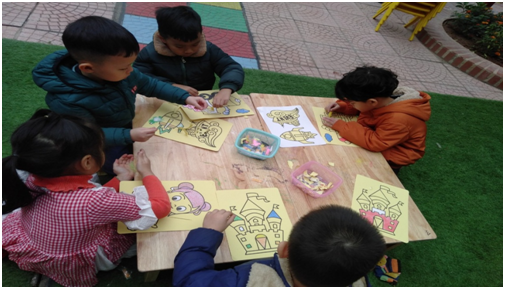 Còn các anh chị khối mẫu giáo lớn thì được hoạt động làm tranh cát: