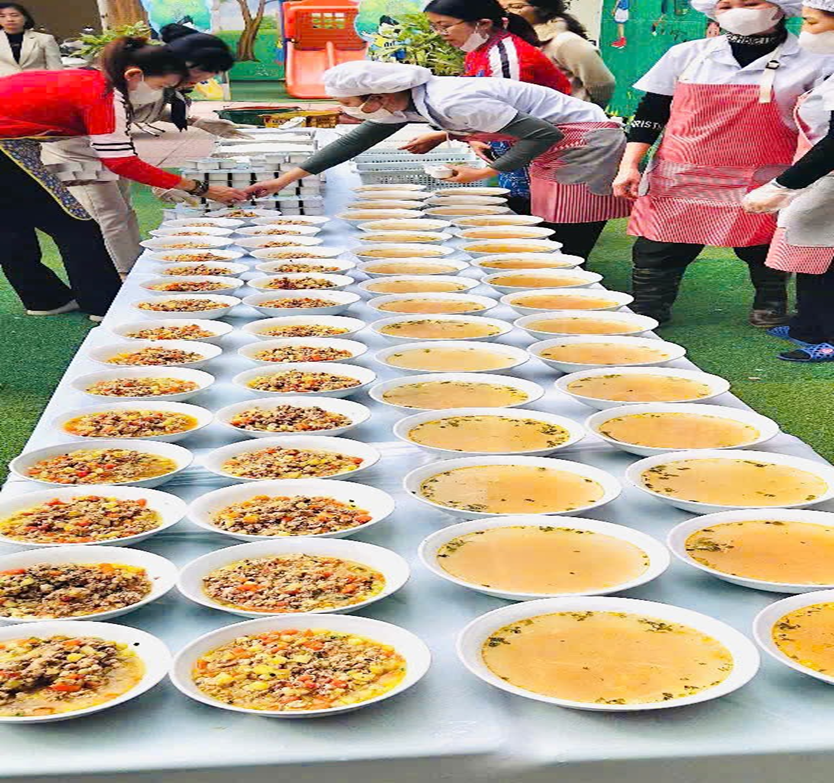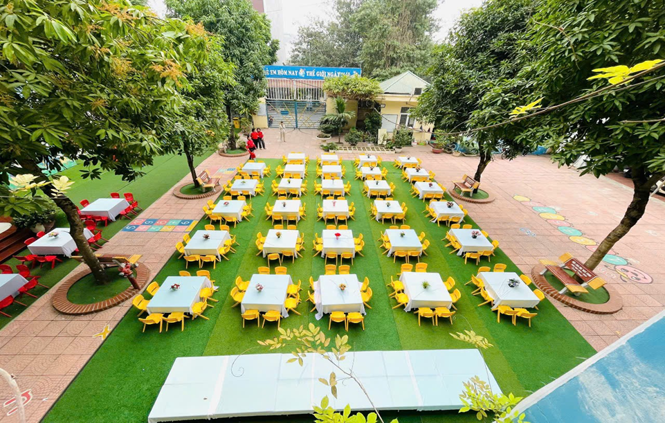 Để tổ chức bữa ăn tập thể vui vẻ tại sân trường các cô đã chuẩn bị bàn ăn, đồ dùng phục vụ cho bữa ăn chu đáo.