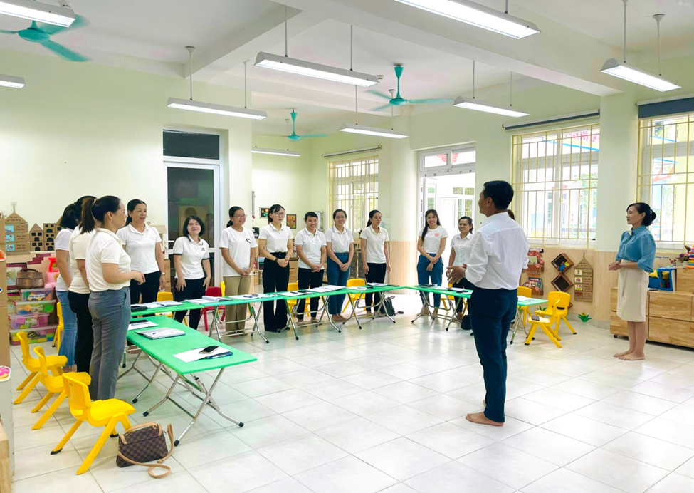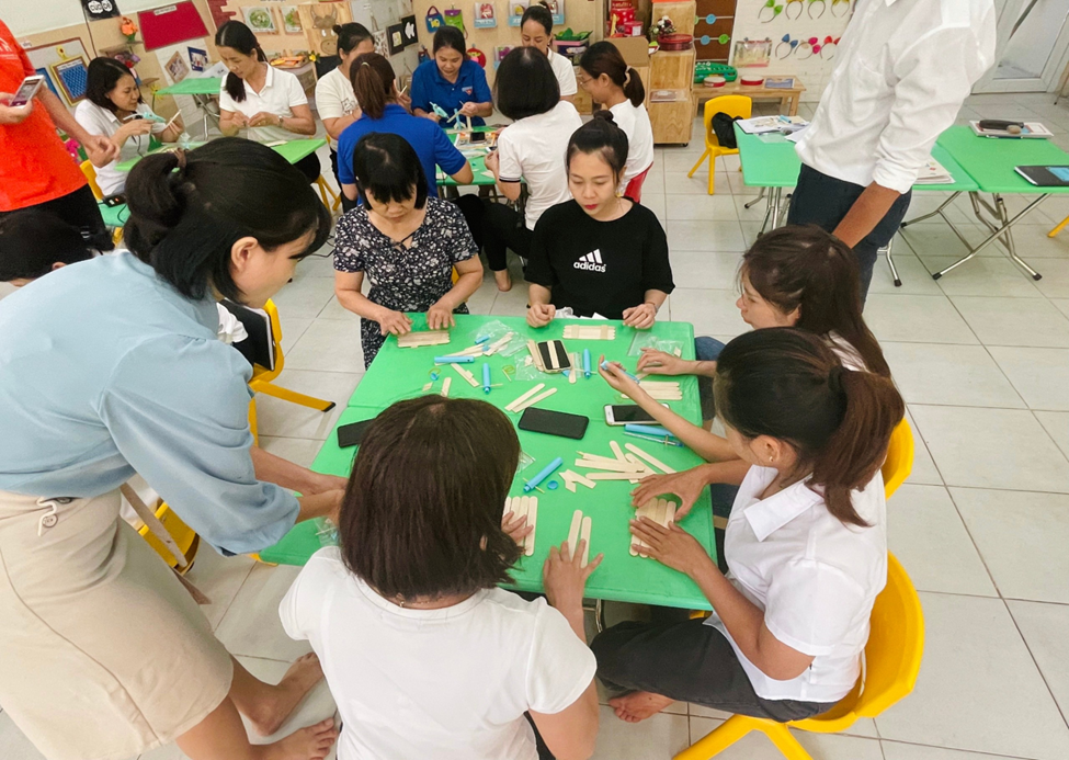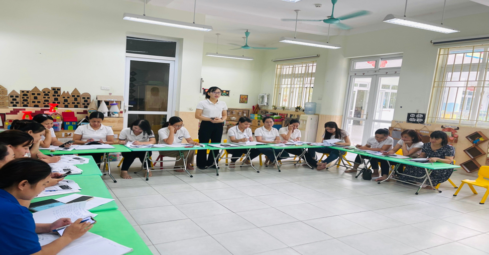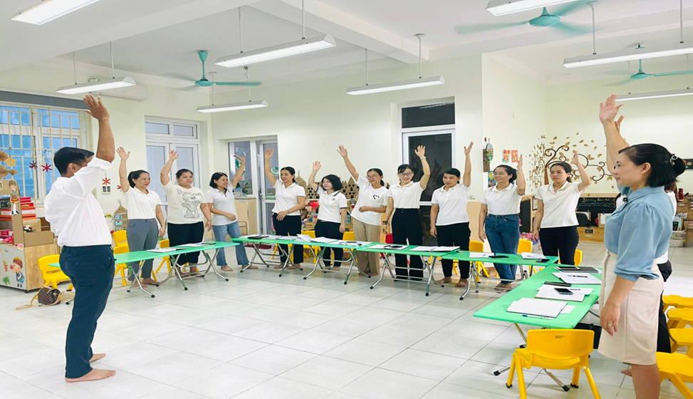 Thực hiện kế hoạch, nhiệm vụ năm học 2022– 2023;Căn cứ công văn số: 342/PGDĐT -MN ngày 23/5/2023 của PGDĐT quận Hà Đông về việc hướng dẫn tổ chức hướng dẫn hè cấp học mầm non quận Hà Đông năm 2023; Căn cứ kế hoạch số 76/KH-MNKĐ ngày 24/5/2023 về việc tổ chức hoạt động chăm sóc giáo dục trẻ trong hè và chuẩn bị mọi điều kiện cho năm học 2023-2024, nhằm nâng cao năng lực chuyên môn cho cán bộ quản lý và giáo viên, đáp ứng yêu cầu đổi mới giáo dục theo phương pháp giáo dục tiên tiến dạy học hướng đến phát triển năng lực cho trẻ mầm non. Ngày 27/8/2023 trường mầm non Kim Đồng phối hợp với công ty cổ phần đầu tư giáo dục MVA tổ chức tập huấn phương pháp giáo dục Steam, ứng dụng phương pháp giáo dục STEAM trong giáo dục trẻ Mầm non. Buổi tập huấn phương pháp giáo dục STEAM có sự tham gia hướng dẫn của thày Bùi Văn Cương chuyên gia giáo dục mầm non cùng sự có mặt của cô Vũ Thị Hoa – Phó Hiệu trưởng phụ trách chuyên môn, và 100% giáo viên nhà trường. Dưới đây là một số hình ảnh của buổi tập huấn: