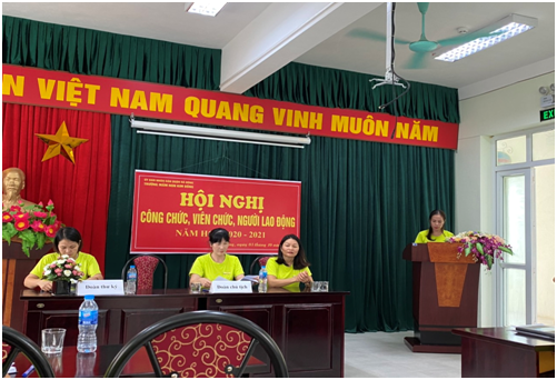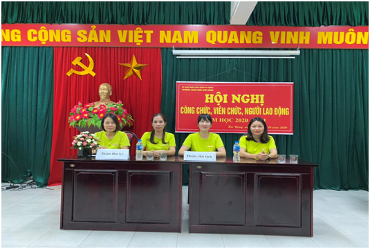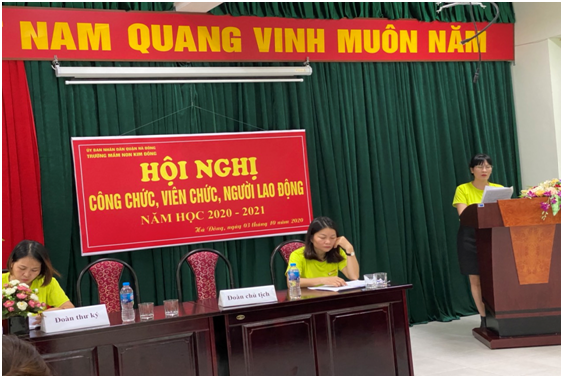 Thực hiện công văn số 2780 của công đoàn ngành giáo dục hướng dẫn về tổ chức Hội nghị Cán bộ, công chức, viên chức năm học 2020- 2021. Nghị Định số 04/2015/NĐ-CP ngày 9/1/2015 của Chính phủ về quy chế thực hiện dân chủ trong hoạt động của cơ quan hành chính nhà nước và đơn vị sự nghiệp công lập. Công văn số 808/HD- PGD ĐT ngày 8/9/2020 của PGD và ĐT quận Hà Đông về việc hướng dẫn tổ chức Hội nghị cán bộ công chức, viên chức trong các đơn vị trường học. Sáng ngày 3/10/2020 Trường Mầm non Kim Đồng đã long trọng tổ chức Hội nghị cán bộ, công chức, viên chức, người lao động năm học 2020 – 2021 nhằm phát huy quyền làm chủ, năng lực sáng tạo của đội ngũ CB, CC, VC trong nhà trường và nhằm thực hiện tốt nhiệm vụ năm học 2020-2021. Hội nghị cán bộ, công chức, viên chức là hoạt động thường niên của nhà trường, một mặt đánh giá tuyên dương những kết quả đạt được trong công tác giáo dục của năm học trước, mặt khác nghiêm túc rút ra nguyên nhân của những hạn chế, tồn tại. Từ đó đề ra phương hướng hoạt động phù hợp cho năm học mới. Đây cũng là một hoạt động quan trọng nhằm phát huy quyền làm chủ của cán bộ, giáo viên, từ đó đề xuất ý kiến, bày tỏ nguyện vọng đối với Ban giám hiệu nhà trường để góp phần xây dựng nhà trường ngày càng vững mạnh Về dự Hội nghị CCVC và NLĐ của trường mầm non Kim Đồng năm học 2020 -2021 có sự góp mặt của toàn thể cán bộ, giáo viên, nhân viên với tinh thần đoàn kết, xây dựng cao; trong không khí vui tươi, phấn khởi.