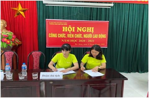 Thay mặt ban chấp hành công đoàn nhà trường, đồng chí Nguyễn Thị Thập- Chủ tịch Công Đoàn lên phát động phong trào thi đua năm học 2020 – 2021 và thực hiện ký giao ước thi đua của các bộ phận chuyên môn về việc thực hiện nghị quyết Hội nghị CCVC, người lao động trường MN Kim Đồng năm học 2020- 2021.