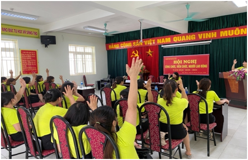 Tiếp theo, Đồng chí Nguyễn Thị Bích Lệ- Thư ký hội nghị lên thông qua dự thảo nghị quyết hội nghị. Đồng Chí Đinh Thị Thanh- BT chi bộ- HT nhà trường thay mặt Đoàn chủ tịch lên lấy biểu quyết cho dự thảo nghị quyết và bế mạc hội nghị