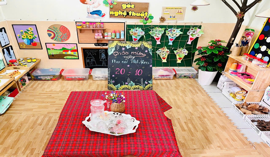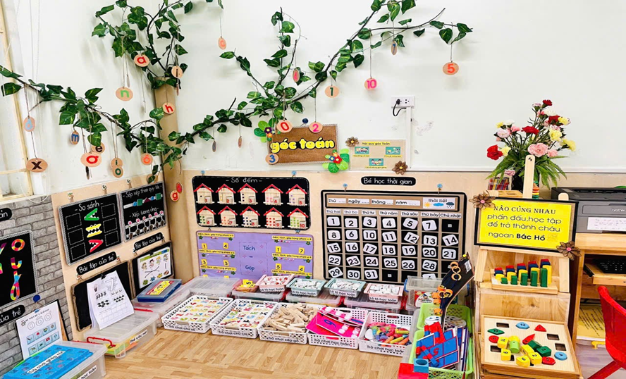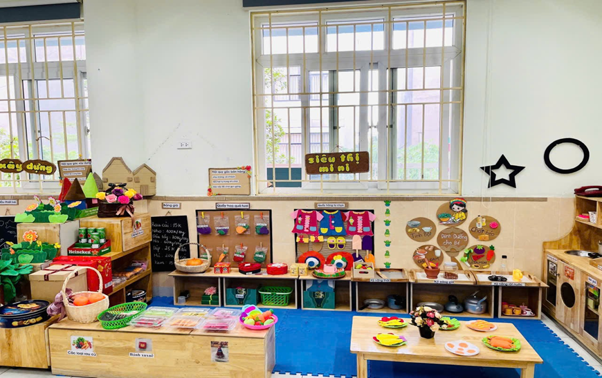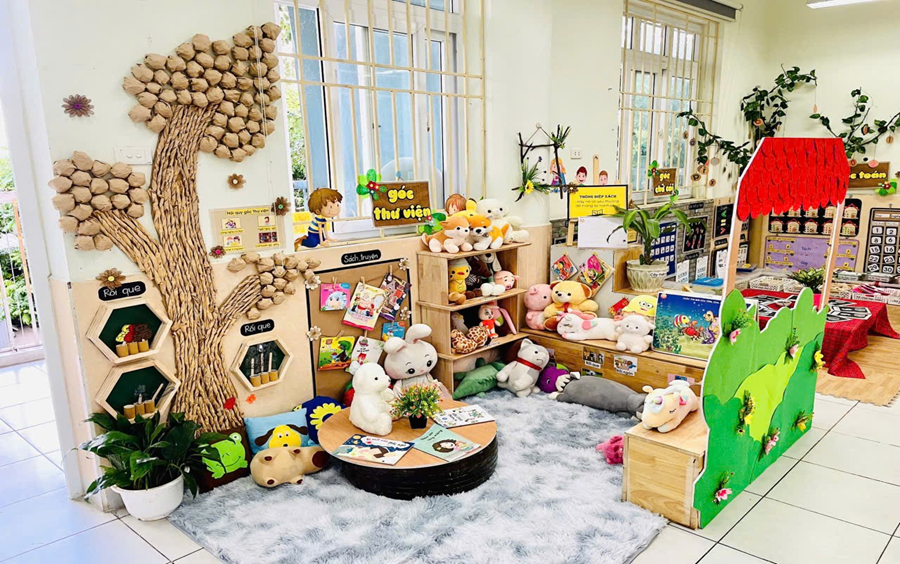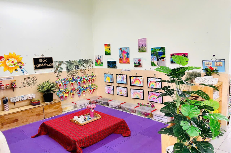 Mỗi một đồ dùng, đồ chơi, mỗi một góc chơi được các giáo viên sắp xếp đảm bảo tính phù hợp cho từng hoạt động, từng chủ đề tạo hứng thú học tập, vui chơi cho trẻ. Các góc hoạt động được trang trí tạo môi trường theo hướng mở lấy trẻ làm trung tâm với nhiều đồ dùng đồ chơi tự tạo, đa dạng về kiểu dáng, màu sắc, chất liệu. Các góc được bài trí đẹp đẽ, tao nhã, từ góc nghệ thuật nơi lưu giữ những sản phẩm đẹp của trẻ đến góc sách truyện, phân vai,.. đều được các lớp sắp xếp rất khoa học và ngăn nắp, mỗi lớp một vẻ, tận dụng tối đa những hành lang, hiên trước, sau lớp học để tạo ra những góc chơi cho trẻ khám phá trải nghiệm mọi lúc mọi nơi…