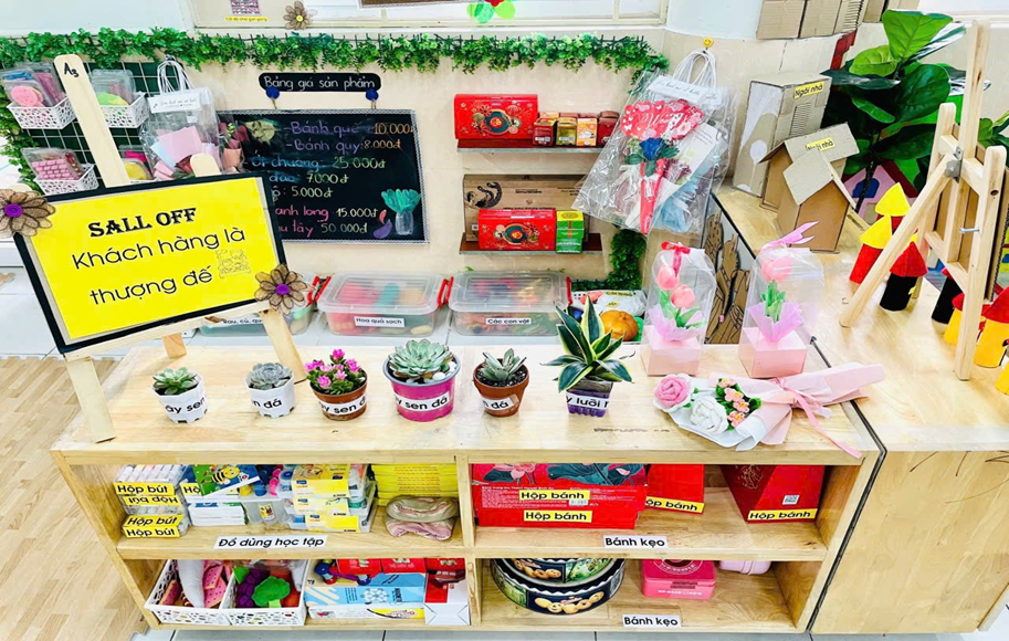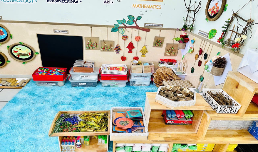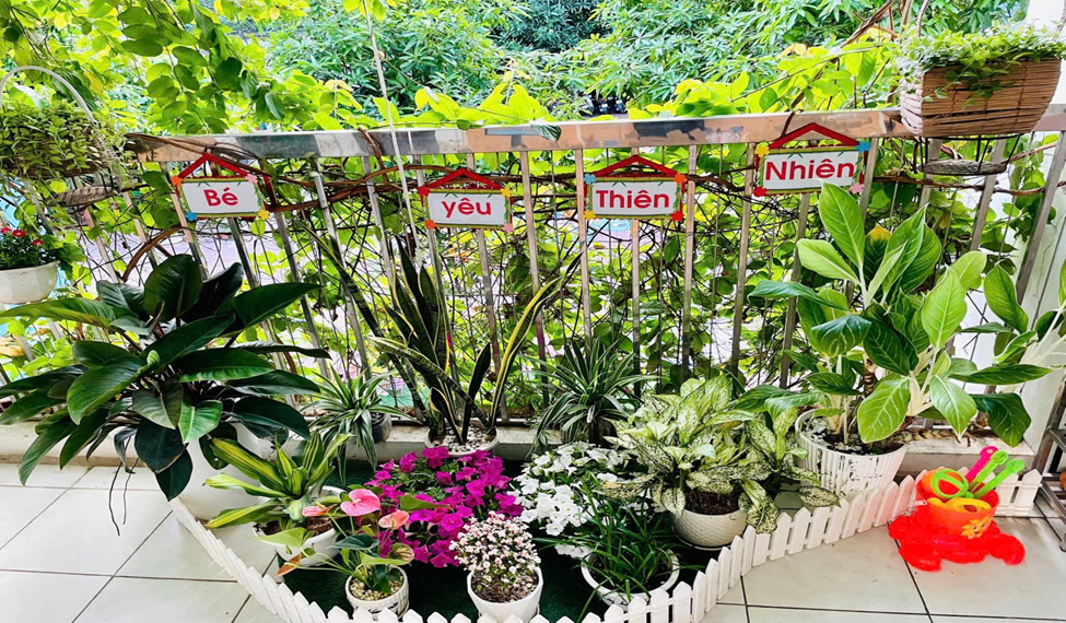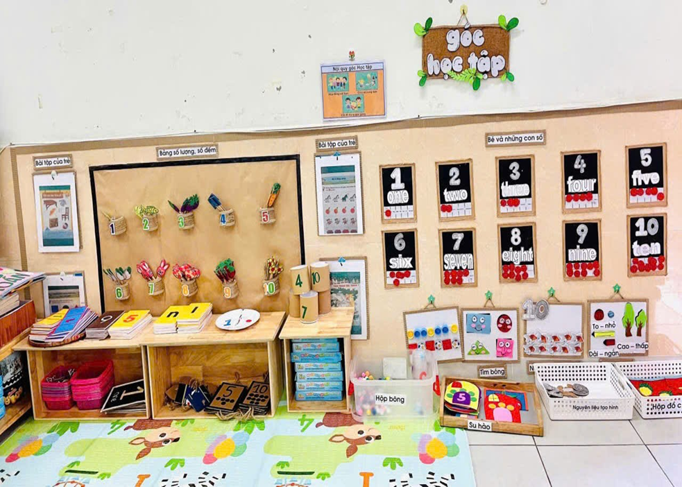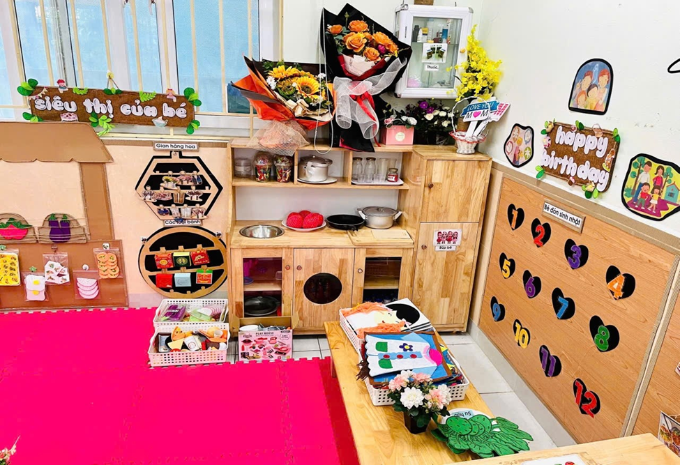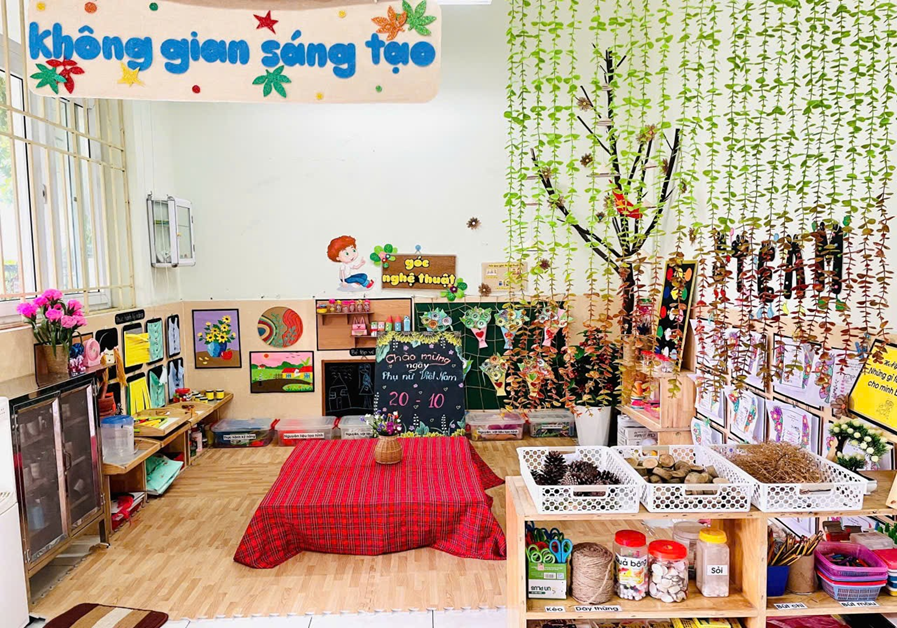 Nhiều lớp đã tận dụng những phế liệu như chai, lọ… những nguyên vật liệu thiên nhiên gần gũi dễ kiếm, dễ sử dụng để cho trẻ hoạt động và tạo ra các sản phẩm của cô và trẻ phong phú. Trẻ có thể thoải mái hoạt động ở các góc chơi. Với khu vực cửa nhóm lớp bố trí góc tuyên truyền giúp tuyên truyền tới phụ huynh về các hoạt động chăm sóc giáo dục trẻ, các nội dung phối hợp với cha mẹ để chăm sóc, giáo dục trẻ...
