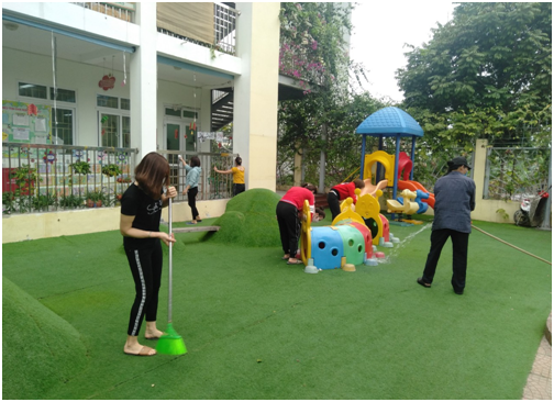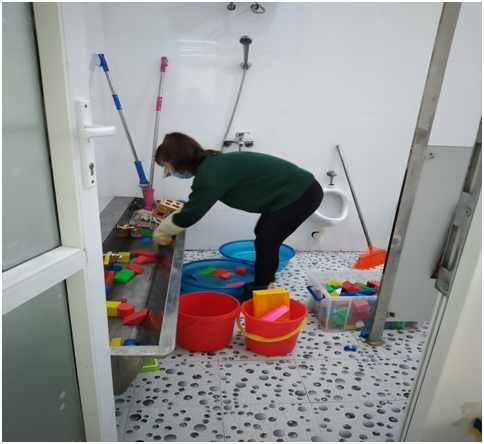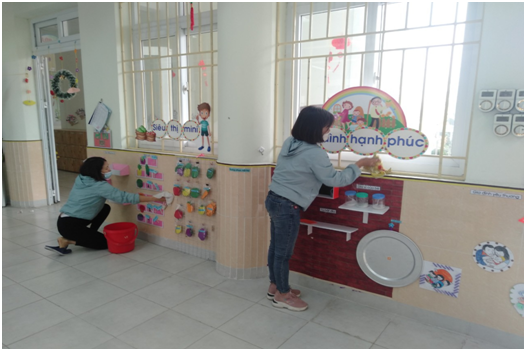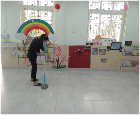 Giáo viên vệ sinh  lớp học, lau rửa đồ chơi.