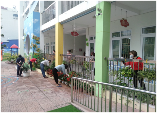 Sau đây là một số hình ảnh công tác CBGVNV tổng vệ sinh, khử khuẩn môi trường chuẩn bị đón các bé đến trường sau thời gian nghỉ phòng dịch Covid-19: