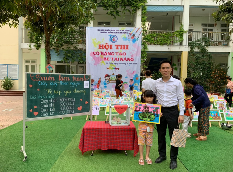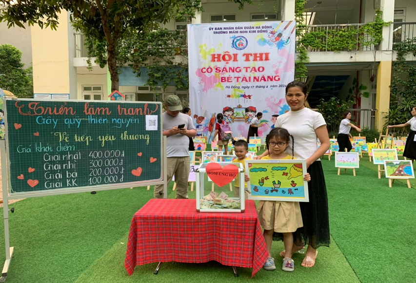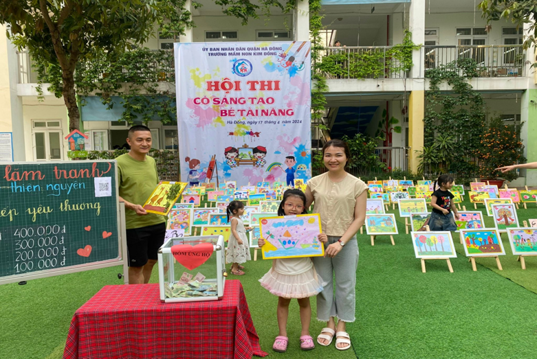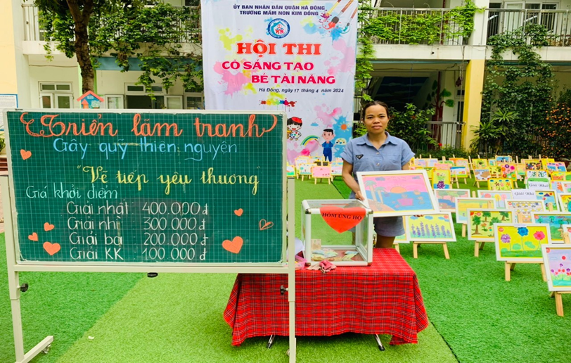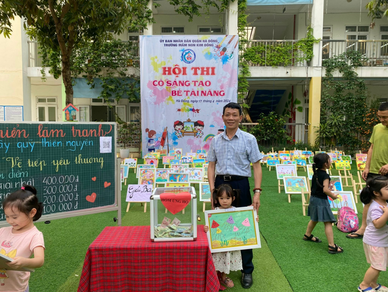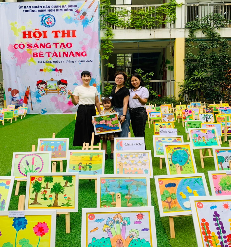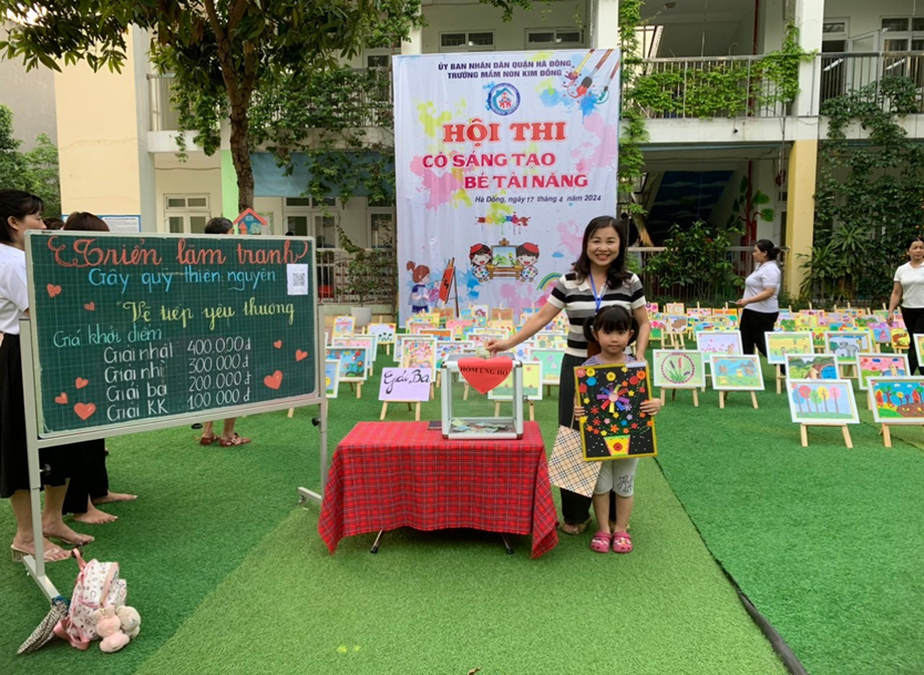 Chiều ngày 17/04/2024, trường mầm non Kim Đồng đã tổ chức hội thi " Cô sáng tạo - Bé tài năng" nhằm kích thích trí tưởng tượng sáng tạo, củng cố kỹ năng tạo hình cho trẻ. Bên cạnh đó,để những tác phẩm của trẻ không chỉ đẹp mà còn mang lại thông điệp ý nghĩa về lòng nhân ái, giúp các bé biết chia sẻ niềm vui và hạnh phúc cho những bạn nhỏ kém may mắn nhà trường đã tổ chức triển lãm tranh trong hội thi " Cô sáng tạo - Bé tài năng"  Gây quỹ ủng hộ cho các bạn nhỏ bị ung thư đang điều trị tại Khoa Nhi Bệnh viện K Tân Triều" vào chiều ngày 19/04/2024.