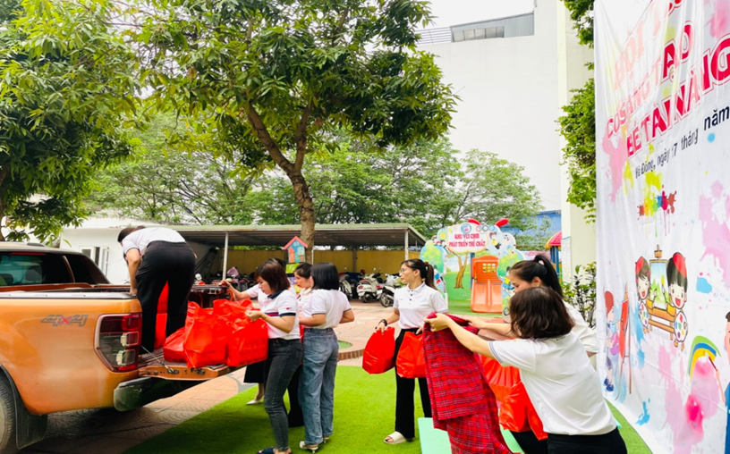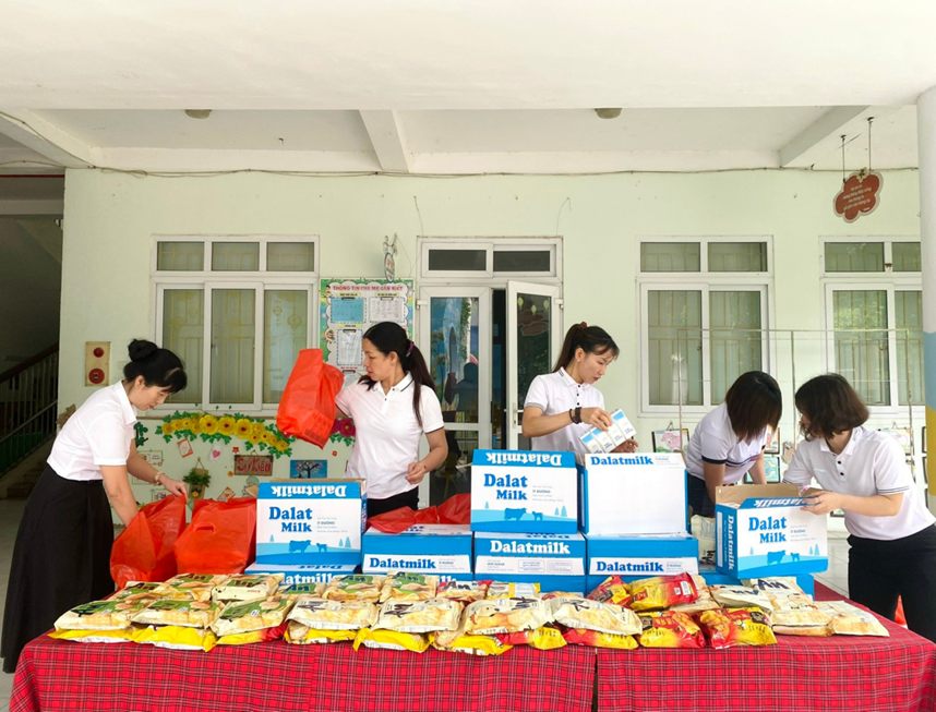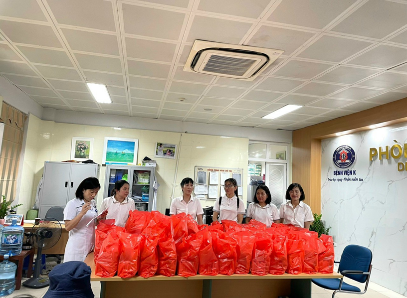 Hình ảnh Tập thể CBGVNV Trường MNKĐ chuẩn bị các phần quà cho các bạn nhỏ điều trị tại Khoa Nhi Bệnh viện K Tân Triều.