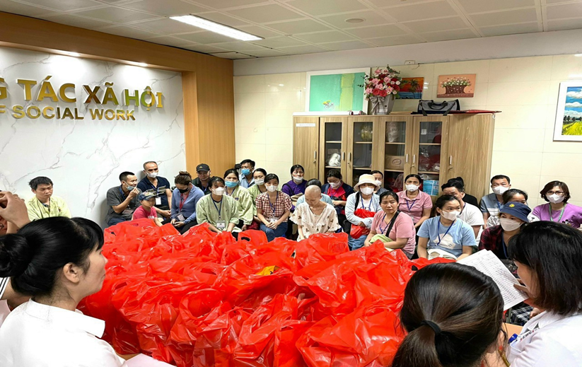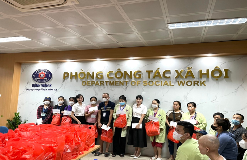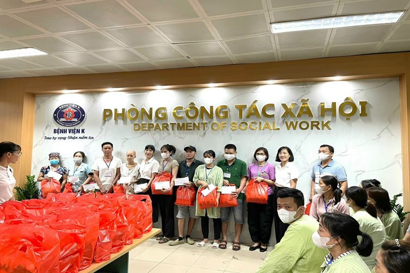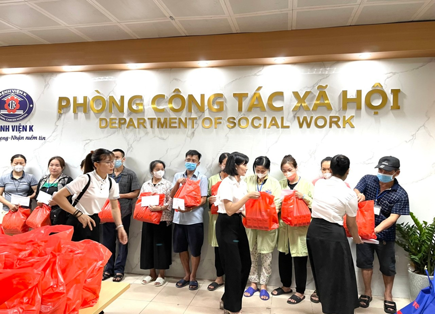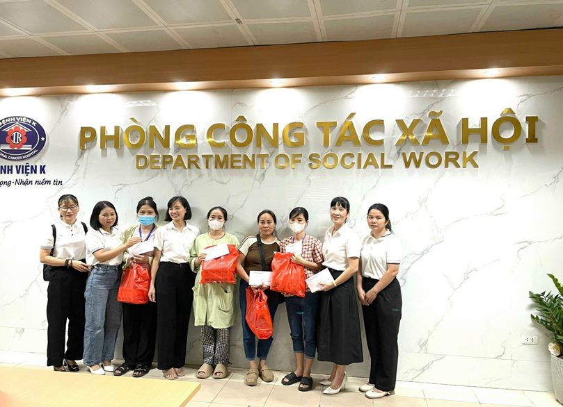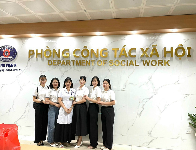 Hình ảnh đoàn thiện nguyện của nhà trường tại phòng công tác xã hội của viện K Tân Triều: