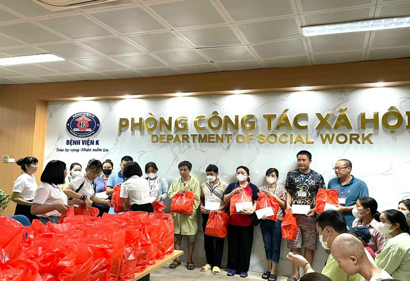 Được sự tiếp đón của Bác sĩ Thảo - Phòng Công tác xã hộivà các các y bác sĩ khoa Nhi, Bệnh viện K Tân Triều. Đoàn thiện nguyện của trường đã được gặp gỡvà trao những phần quà chongười thân của các bệnh nhân trong khoa Nhi cần được giúp đỡ. Đoàn đã tặng 60 suất quà cho 60 bệnh nhân đang điều trị tại Khoa Nhi để phần nào khích lệ động viên tinh thần các em nhỏ trong quá trình điều trị.